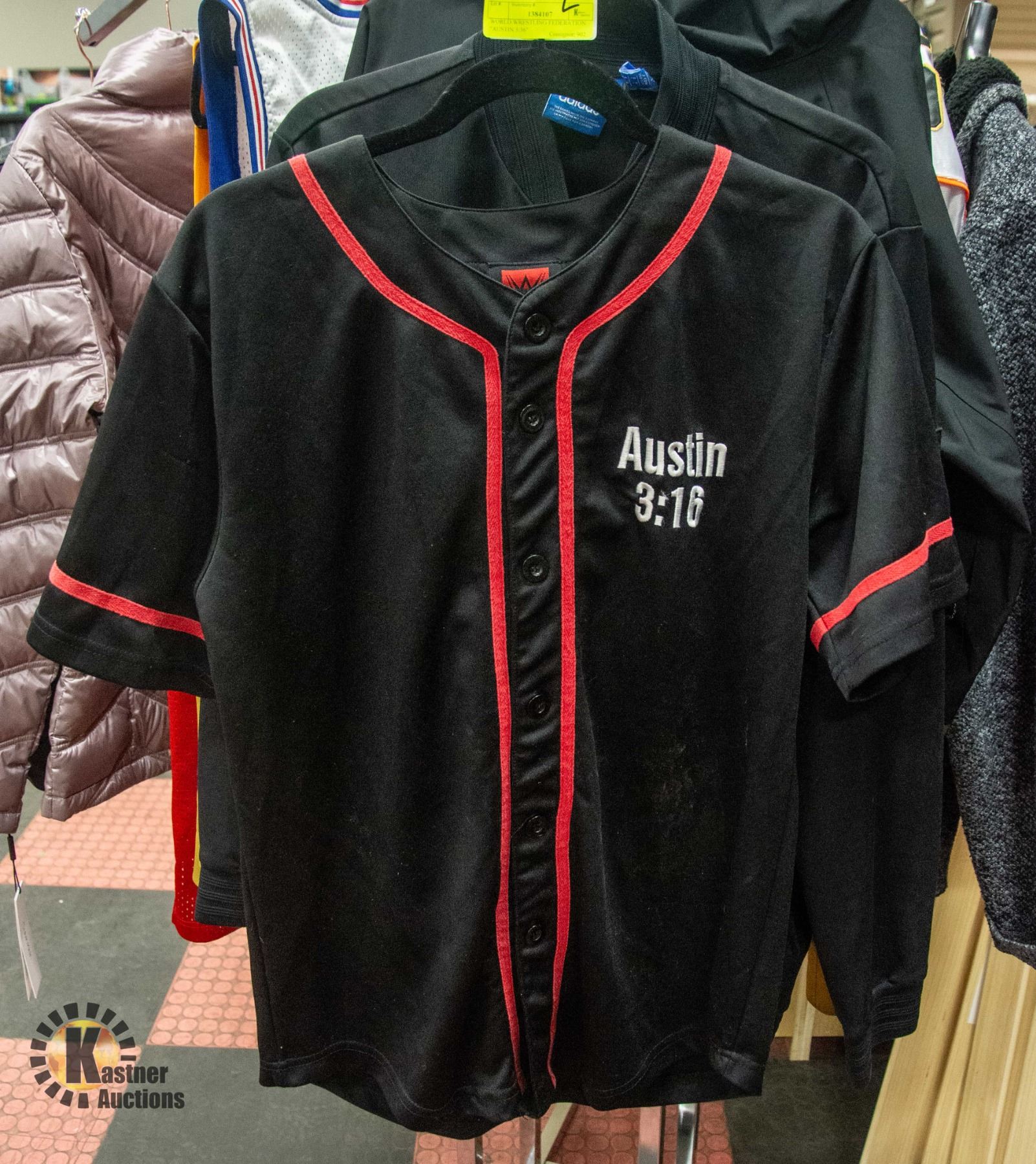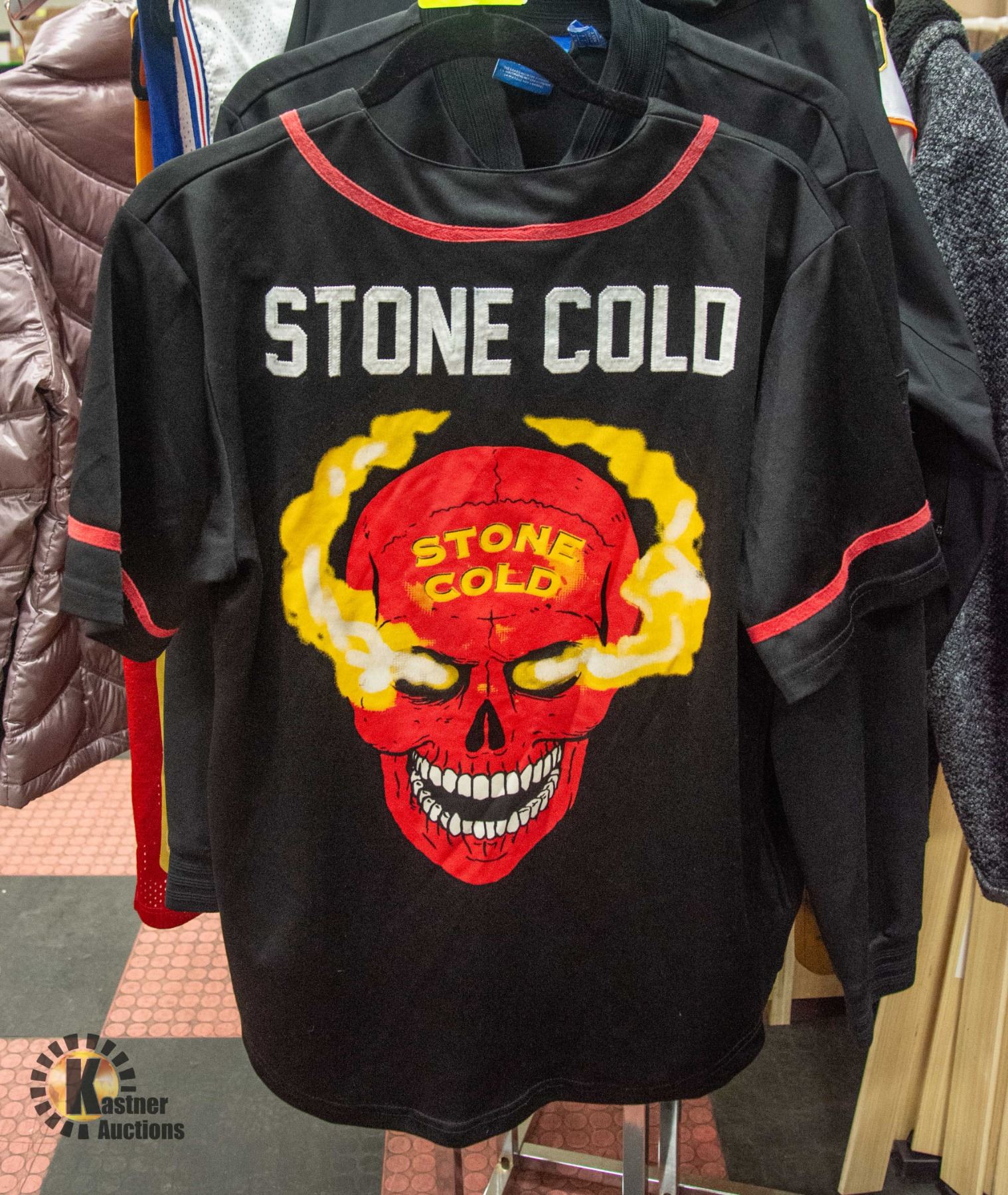 STONE COLD BUTTON-DOWN BLACK & RED SHIRT - COLLECTIBLE SIZE MEDIUM **ALL ITEMS MUST BE REMOVED BY 5PM SATURDAY, FEBRUARY 8TH 2025. ALL REMAINING ITEMS WILL BE SUBJECT TO A $6.00 PER DAY STORAGE CHARGE. ANY ITEMS REMAINING AFTER MONDAY, MARCH 3RD 2025 WILL BE CONSIDERED FORFEITED. NO REFUNDS WILL BE ISSUED FOR FORFEITED ITEMS. TO SCHEDULE A PICK UP APPOINTMENT CLICK HERE