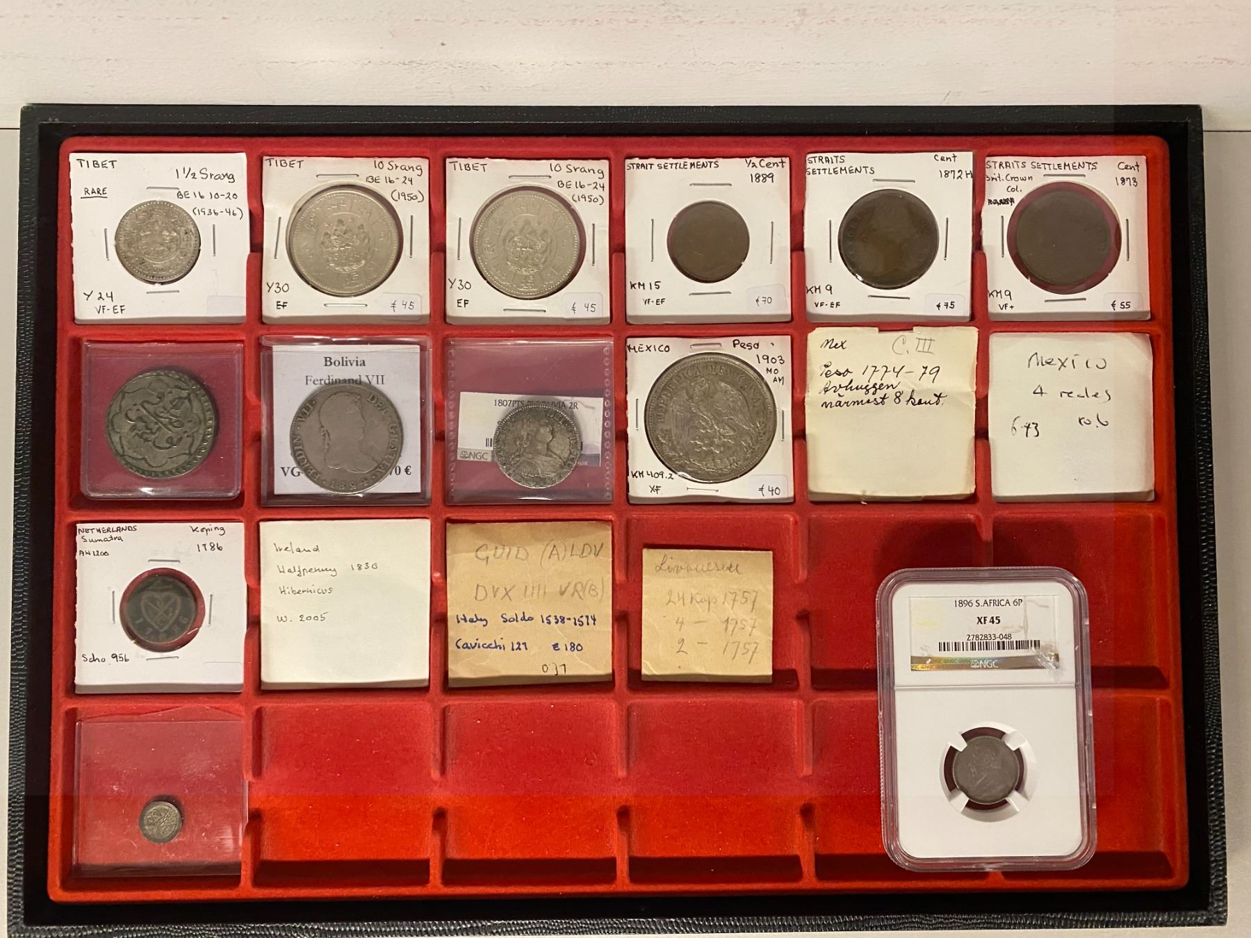WORLDWIDE: LOT of 18 coins, including some rarer pieces, from Africa (2): South Africa (1896 6 pence NGC XF45), Tunis (1 AR piastre AH1247); Americas (5): Bolivia (2 Spanish silvers), Mexico (3 silvers, incl. a Carlos III 8 reales cut for unknown reason, and a likely local imitation of a cob 4 reales); Asia (7): Dutch Sumatra (1), Straits Settlements (3 Victoria bronzes), Tibet (3 silver multiple srangs); Europe (4): Ireland (1 halfpenny 1830), Italian States (1 Urbino AR soldo, Cavicchi-127), Ottoman Empire (1), Russian Livonia (1 1757 AR 4 kopecks, clipped); various conditions; retail value $500, lot of 18 pieces.