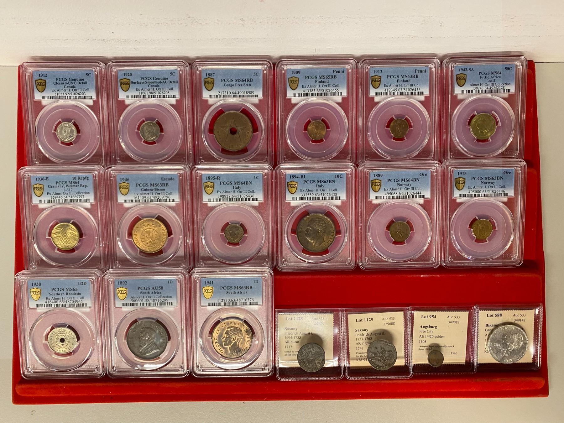 WORLDWIDE: LOT of 19 coins, a diverse group of PCGS graded coins including; Canada AR 5 cents 1912 UNC details, AR 5 cents 1920 AU details, Congo Free State AE 5 centimes 1887 MS-64RB, Finland AE penni 1909 MS-65RB, AE penni 1912 MS-63RB, French Equatorial Africa 50 centimes 1942-SA MS-64, Germany 10 reichspfennig 1936-E MS-64, Portuguese Guinea AE escudo 1946 MS-63RB, Italy AE centesimo 1895-R mS-64BN, AE 10 centesimi 1894-BI MS-63BN, Norway AE ore 1889 MS-64BN, AE ore 1913 MS-63BN, Southern Rhodesia ½ penny 1938 MS-65,South Africa AE penny 1892 AU-58, AE penny 1941 MS-63RB, plus some 'raw' coins Augsberg AE 1/420 gulden 1608 Fine, Saxony AR 2 groschen 1747 Fine, AR ducat 1717 off metal strike Fine, and Bikanir AR rupee 1892 XF, a lovely group of slabbed coins, retail value $750, lot of 19 coins, ex Almer H. Orr III Collection.
