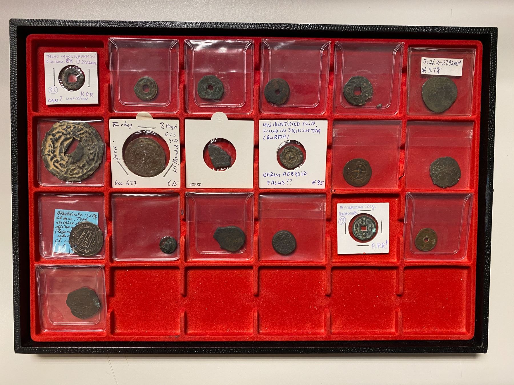 WORLDWIDE: LOT of 19 copper pieces, including: Sogdian cash coins (8 pcs, various types, lower grades); Parataraja (1, Koziya, Pieper 2013:806); Georgia (2, Bagratid), Eastern Europe Imitation (1, bracteate, copper imitation of Abbasid or Samanid dirham); Ilkhan (1, Georgian/Armentian type, nice strike but some green disease); Turkey (1, 19th century gamblian token); Chaghatayid (1, Boyan Quli Khan), large copper bracteate of unknown origin (1, perhaps late Medieval or early Modern); and illegible (3); average VG to Fine condition, many with defects or porosity, some identified by the consignor; retail value $500, lot of 19 pieces.