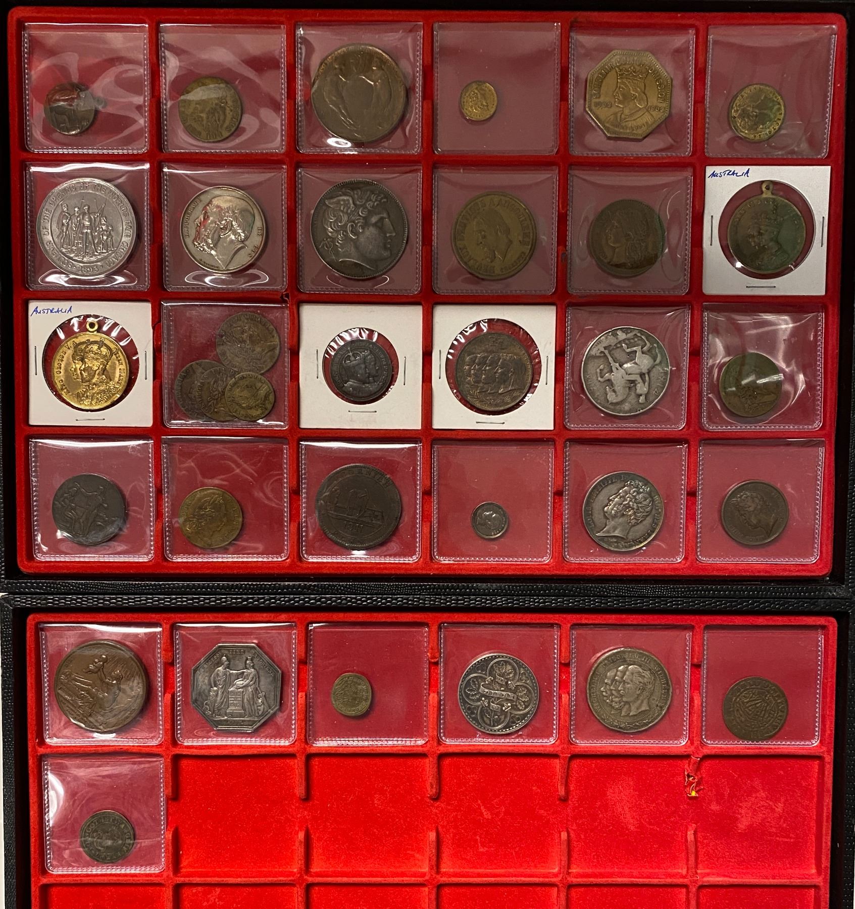 WORLDWIDE: LOT of 38 tokens and medals, including Argentina (1 pc, 1904 medal), Australia (2, 1911 and 1937 AE medals), France (11, 2 tokens and 9 medals or jetons), German States/Prussia (1, AR medal), Germany (2, rechenpfennigs), Great Britain (15, 5 medals and 10 tokens, including spade 1/2 and 1 guinea tokens), Spain (?) (1, AE medalet), and United States (5, 4 so-called dollars and 1 token); average circulated grades, as well as a few uncs, some silver, in consignor's holders, viewing recommended; retail value $1025, lot of 38 pieces.