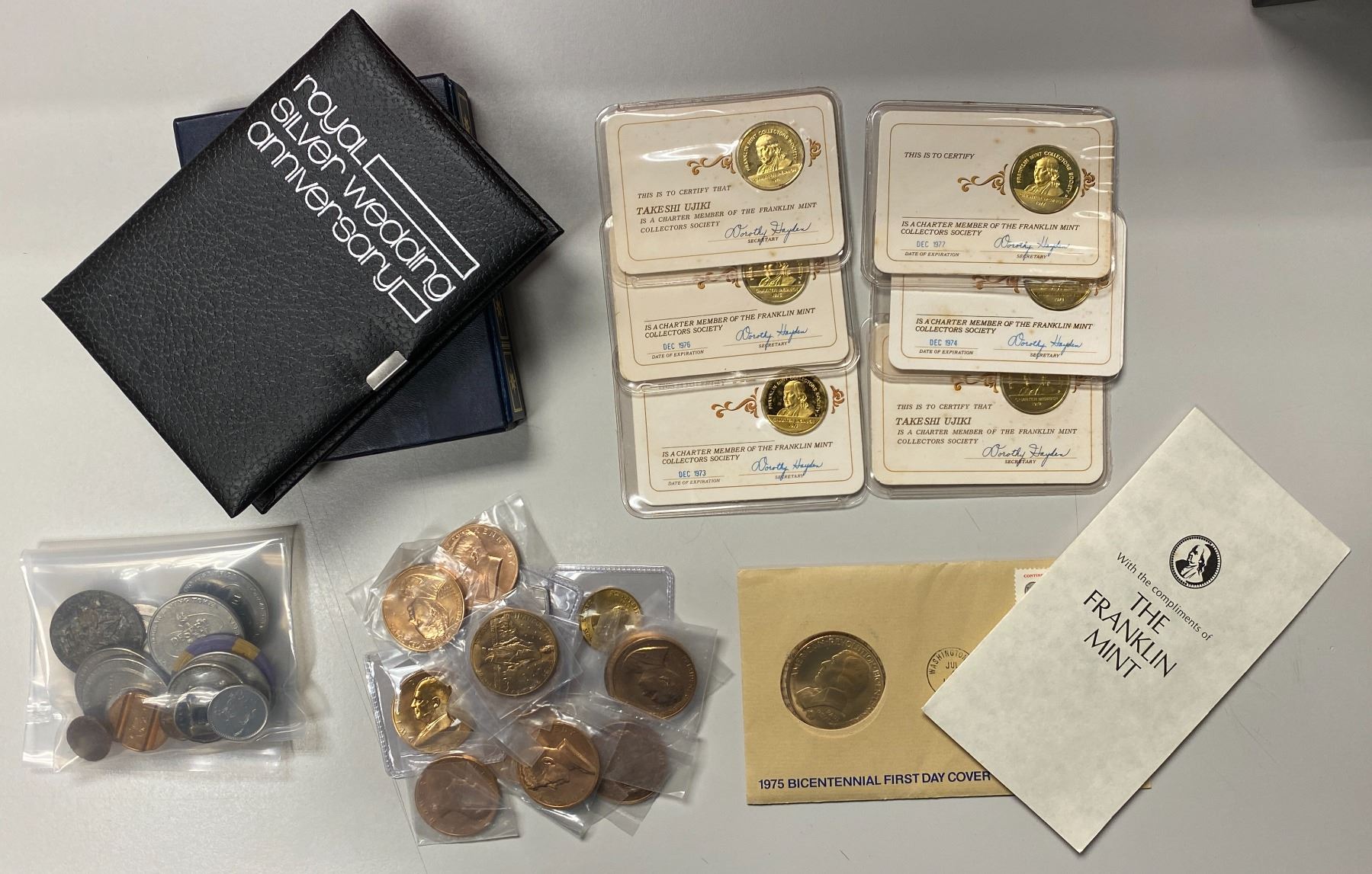 WORLDWIDE: LOT of 50 exonumia items, including 1972 3-piece AR Elizabeth II/Prince Philip Silver Wedding Anniversary proof medal set in case with COA, ND (ca. 1970s) Franklin Mint AR Zodiac medalet proof set with (broken) case and COA, ND Dwight D. Eisenhower 34mm AE Inauguration medal (4 pcs), Richard M. Nixon 34mm AE medal (4), ND John F. Kennedy 34mm AE Inauguration medal (4), 1946 Good Luck Horseshoe token with encased cent-Vote Doc Hill for Senator, ND James Monroe gilt AE medalet, 1971-7 Franklin Mint Collectors Society gilt AE medalet in card (6), ND AR Apollo 14 miniature medalet, 1975 AE Bicentennial First Day Cover, and 26 miscellaneous exonumia pieces loose; all unc except for the Hamakua tokens in VF-EF, in consignor's holders and original cases, viewing recommended; retail value $500, lot of 50 pieces.