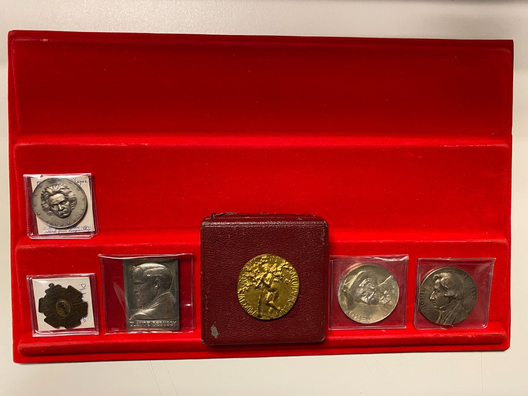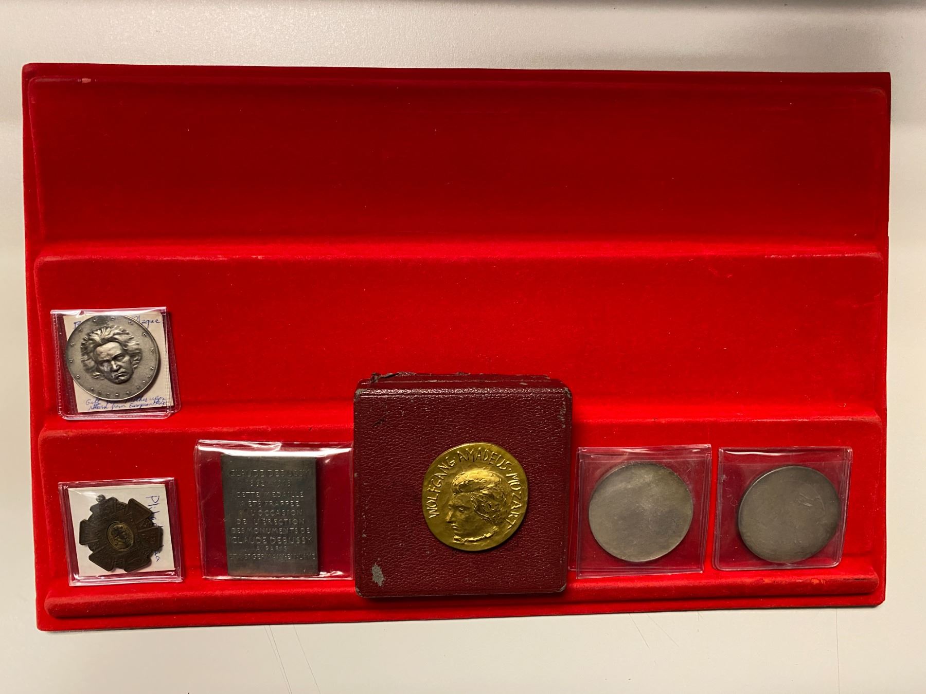 WORLDWIDE: LOT of 6 medals, all depicting musicians, including ND (1910) silvered AE 50mm Austria Fryderyk Chopin, 1927 silvered AE 40mm Austria Beethoven, 1956 Austria gilt AE 50x47mm (oval) Wolfgang Amadeus Mozart in original box, ND France AR 60x42mm Claude Debussy plaque, 1897 AE 36mm National Sanger Fest-Mozart, and ND silvered AE (?) 50mm Giuseppi Verdi; average circulated grades, with some better, in consignor's holders, viewing recommended; retail value $425, lot of 6 pieces.