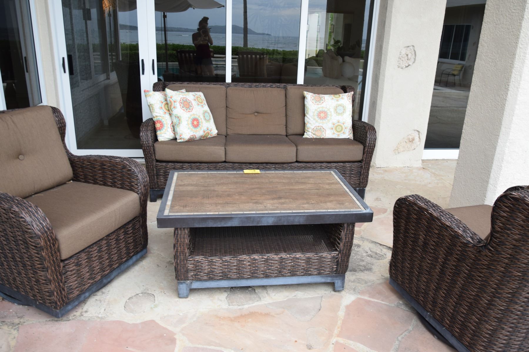 WOVEN SOFA (6' X 3') W/SUNBRELLA COVERED CUSHIONS, 2 GLIDER ARM CHAIRS & TABLE (4 PCS)