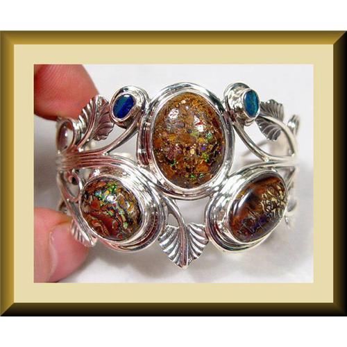 Please note I only ship to Canada and USA and if paypals is used the address MUST BE CONFIRMED.<p>The exotic world of Boulder Opals!! Extravagant and so luxurious at incredible savings. This cuff is dramatic and sure to be remembered as the opals are wrapped in an elaborate silver leaf motif. There are three large boulder opals (The center opal 22x18mm for perspective to size) with two deep blue opals. The bracelet is sized to a 6 with an open cuff design and weighs 48 grams.
