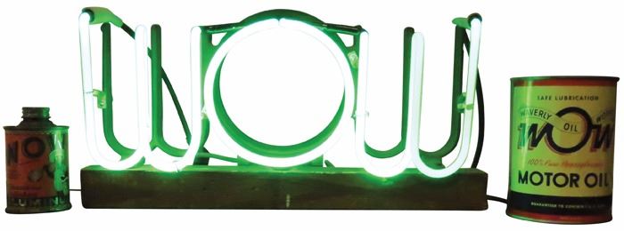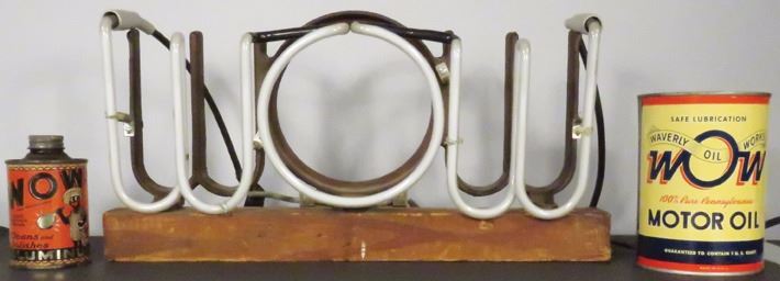 WOW Neon Sign and WOW Tins. Waverly Oil Works motor oil and WOW Aluminum Polish tin with Black Americana image. Sign in beautiful neon green, working condition measures 16 3/4 X 9 X 5 inches.