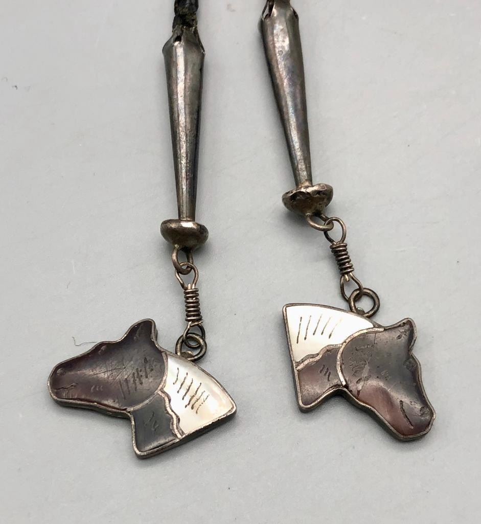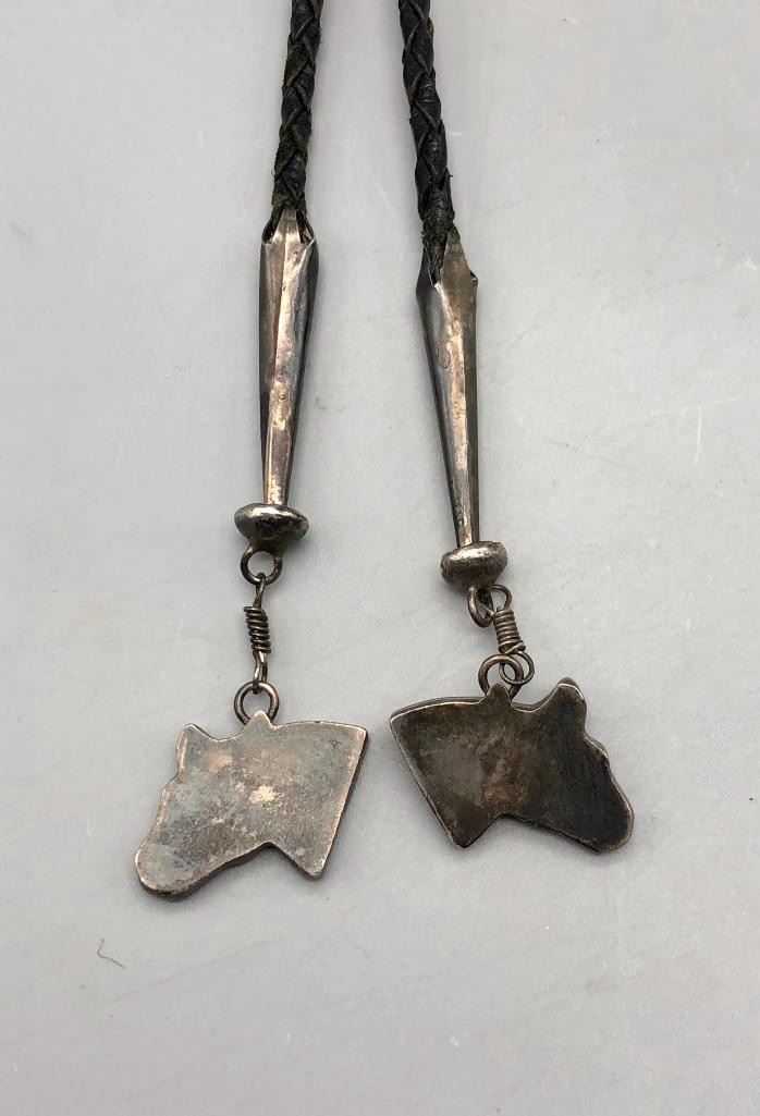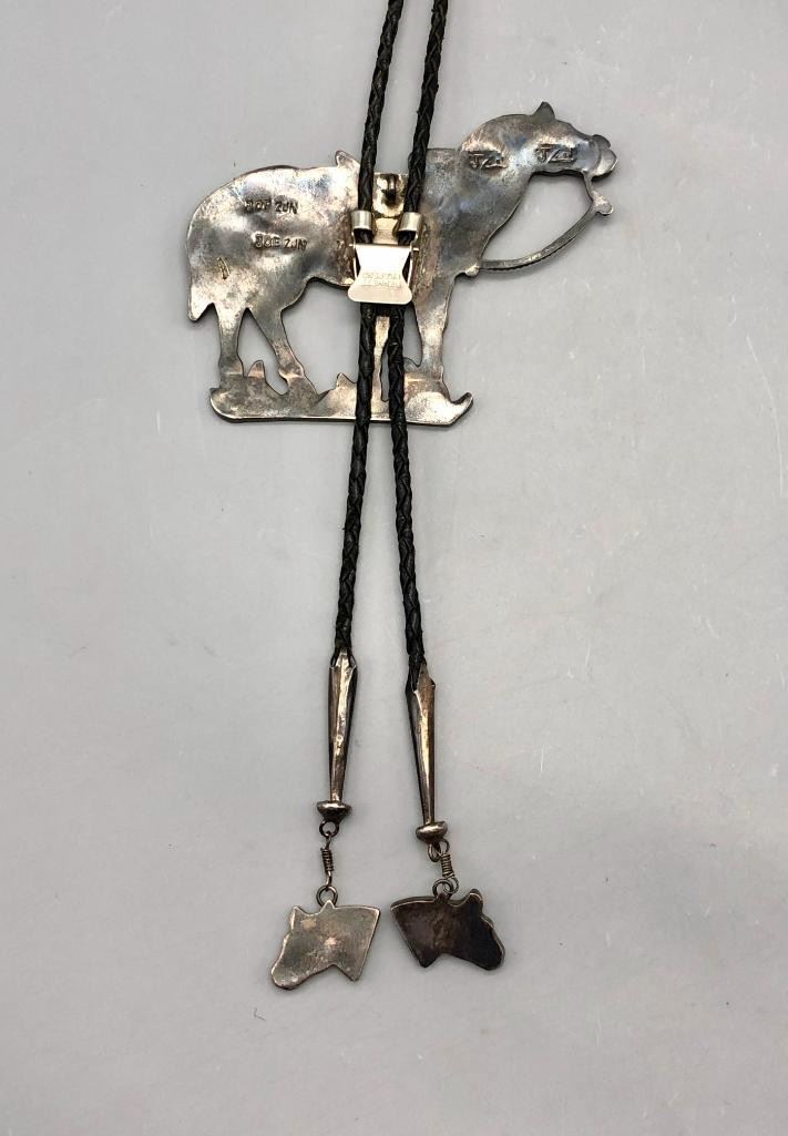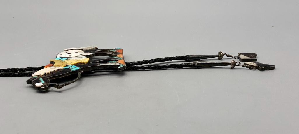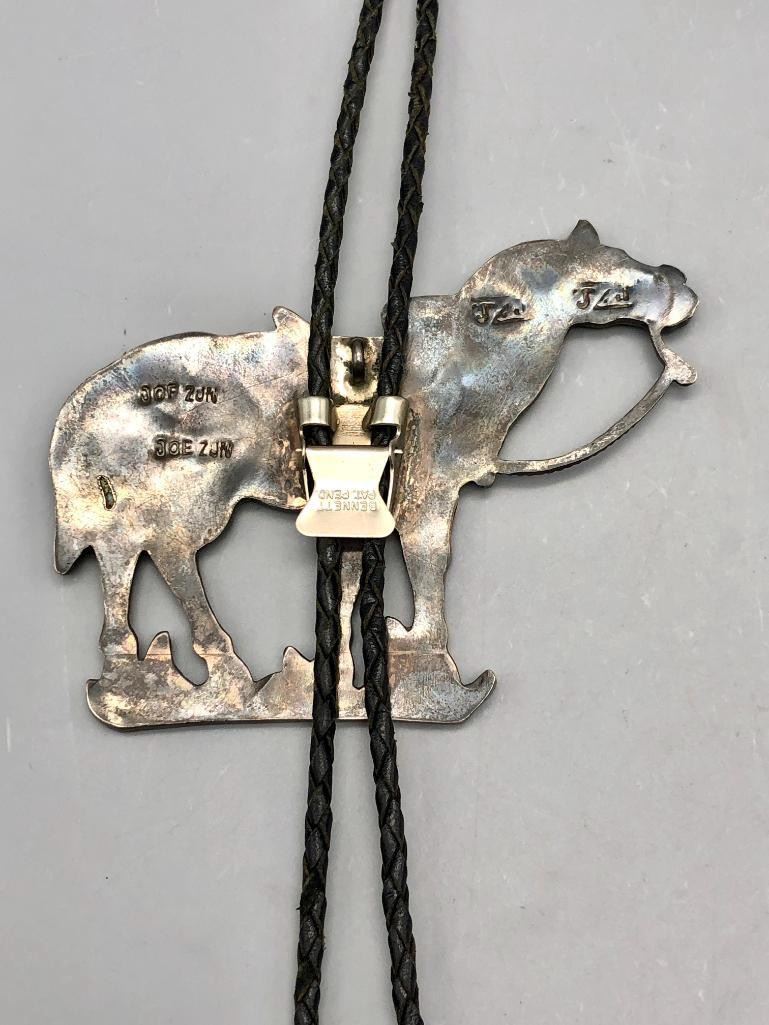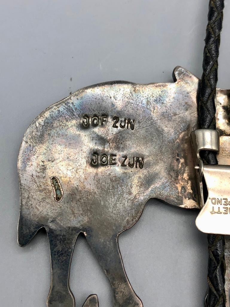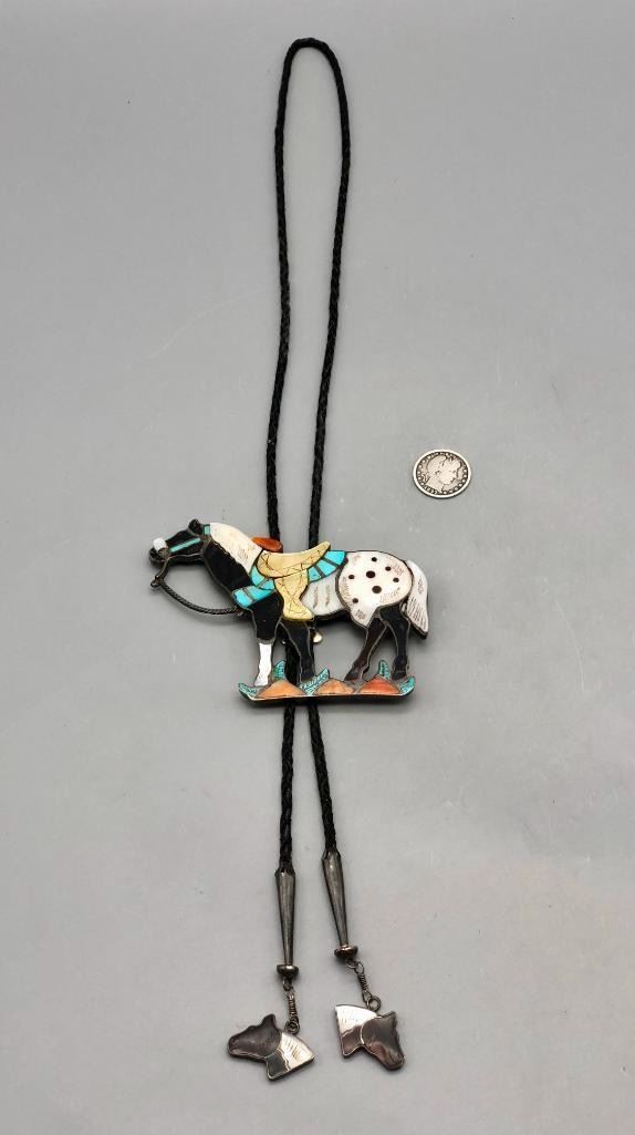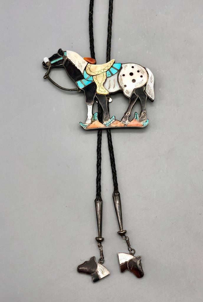 For sale in this lot is a Joe Zunie horse bolo tie with matching tips...WOWZA. This is a stunning bolo tie that features an Appaloosa horse, set with shell, spiny oyster and turquoise. The stones have etched designs giving more detail to the piece, along with nice silverwork for other details like the reins and bridle. It is on a braided, black leather cord and has matching horse head tips. It can also be converted to a pendant and is made from sterling silver. MAKER: Hallmarked JZJ, Joe Zunie ( Zuni). Active 1960s-1970s. APPROX AGE: Circa 1960s-1970s. SIZE: Braided cord measures 41 inches long including tips. Slide measures 3-1/2 inches long X 4-1/2 inches wide. Weighs 90.8 grams. CONDITION: Good for its age, normal wear expected. Please look closely at the pictures as they are an important part of our description and are hereby incorporated into the description, specifically with regards to condition. SHIPPING: There will be a $5 handling / packaging fee for shipping this lot. The actual cost of postage will be added on top of that. BUY IT NOW: If you would like to buy this item now, without waiting for the auction day to bid on it, we do offer this option (which is available up to 48 hours before the actual auction starts). The “Buy it Now” price is the high estimate of this lot (plus applicable fees and the Buyer's premium is discounted to 10% when using the Buy it Now option). If you would like to exercise this option, you must contact us by email (or phone as long as you talk to someone live). Reference this lot number and your intention to "Buy it Now."