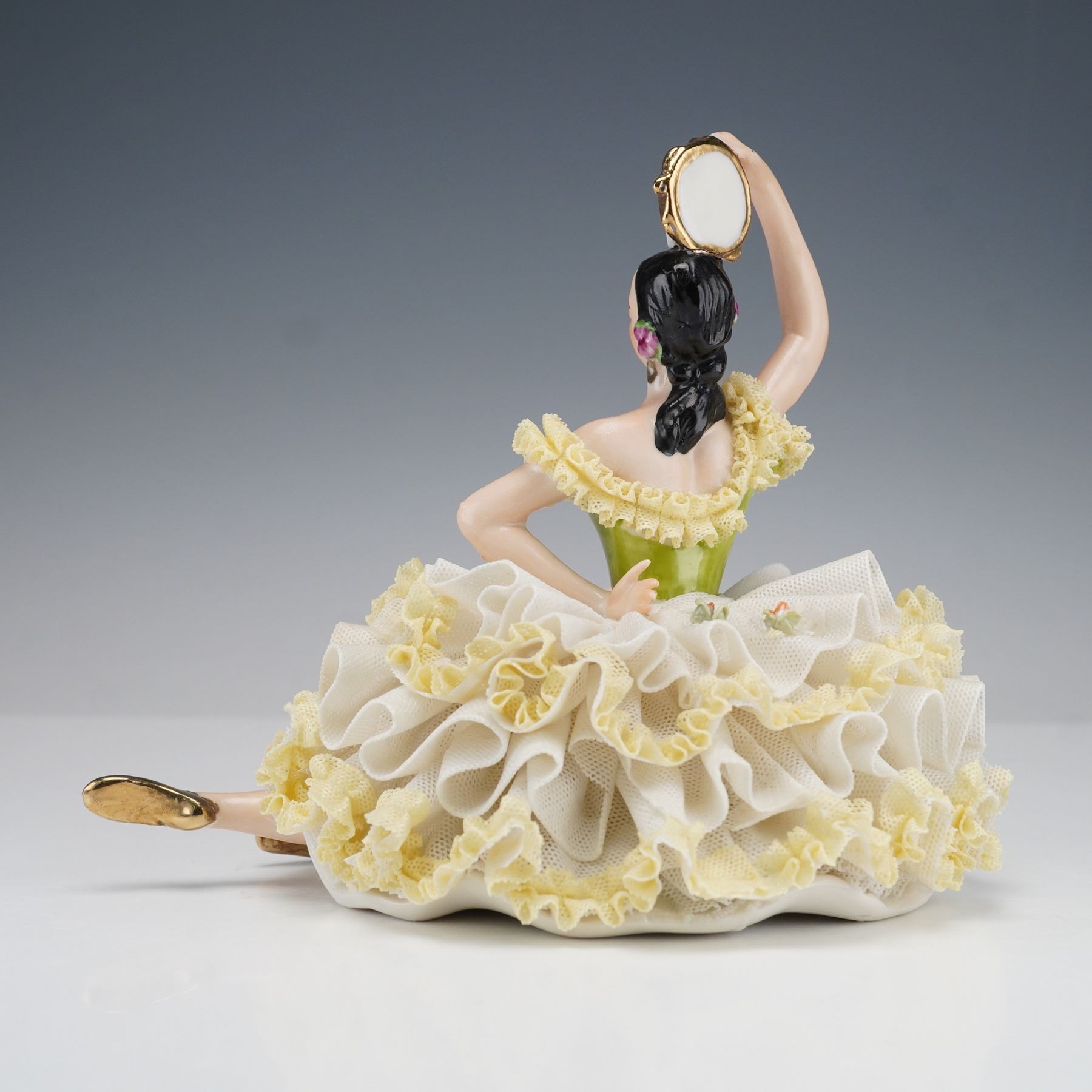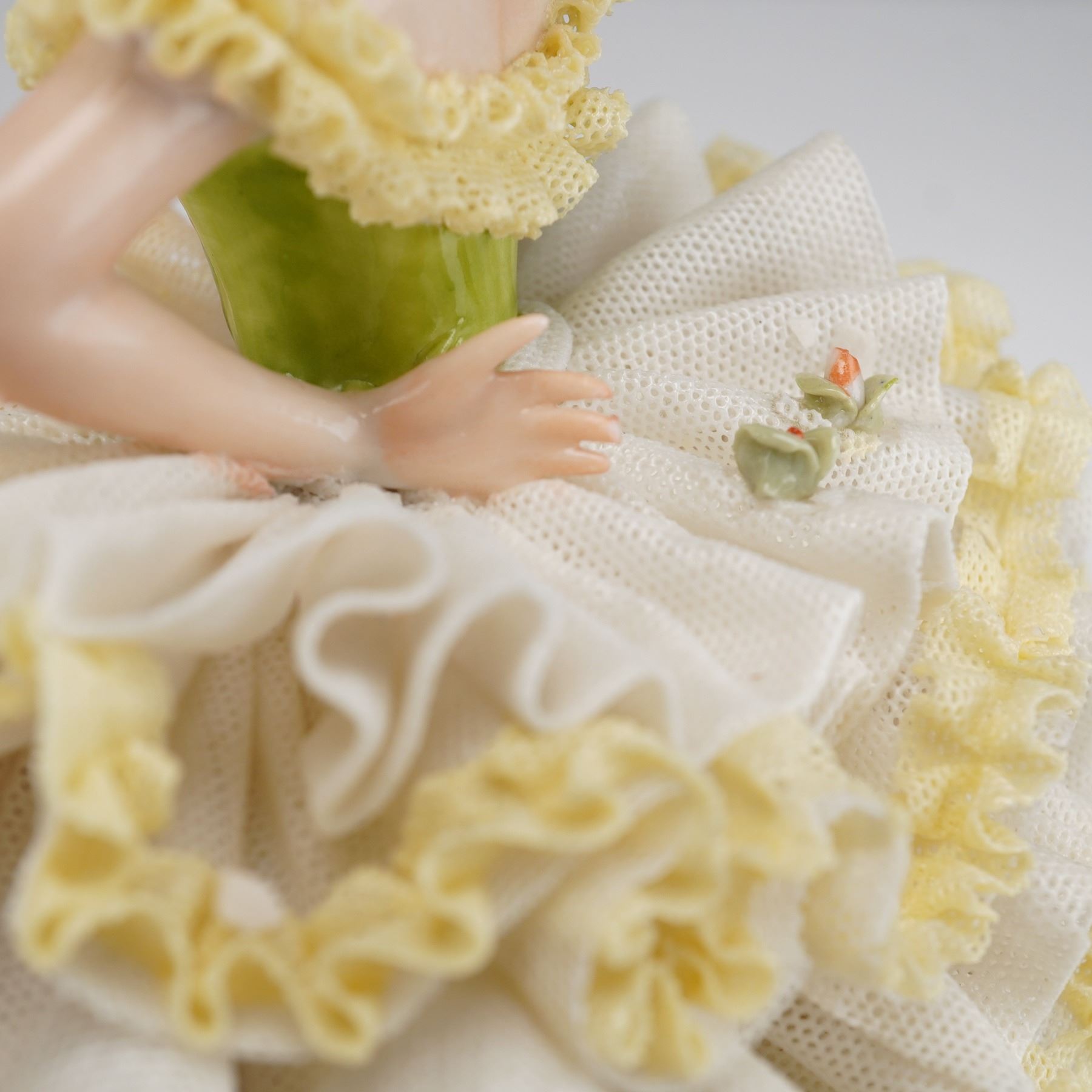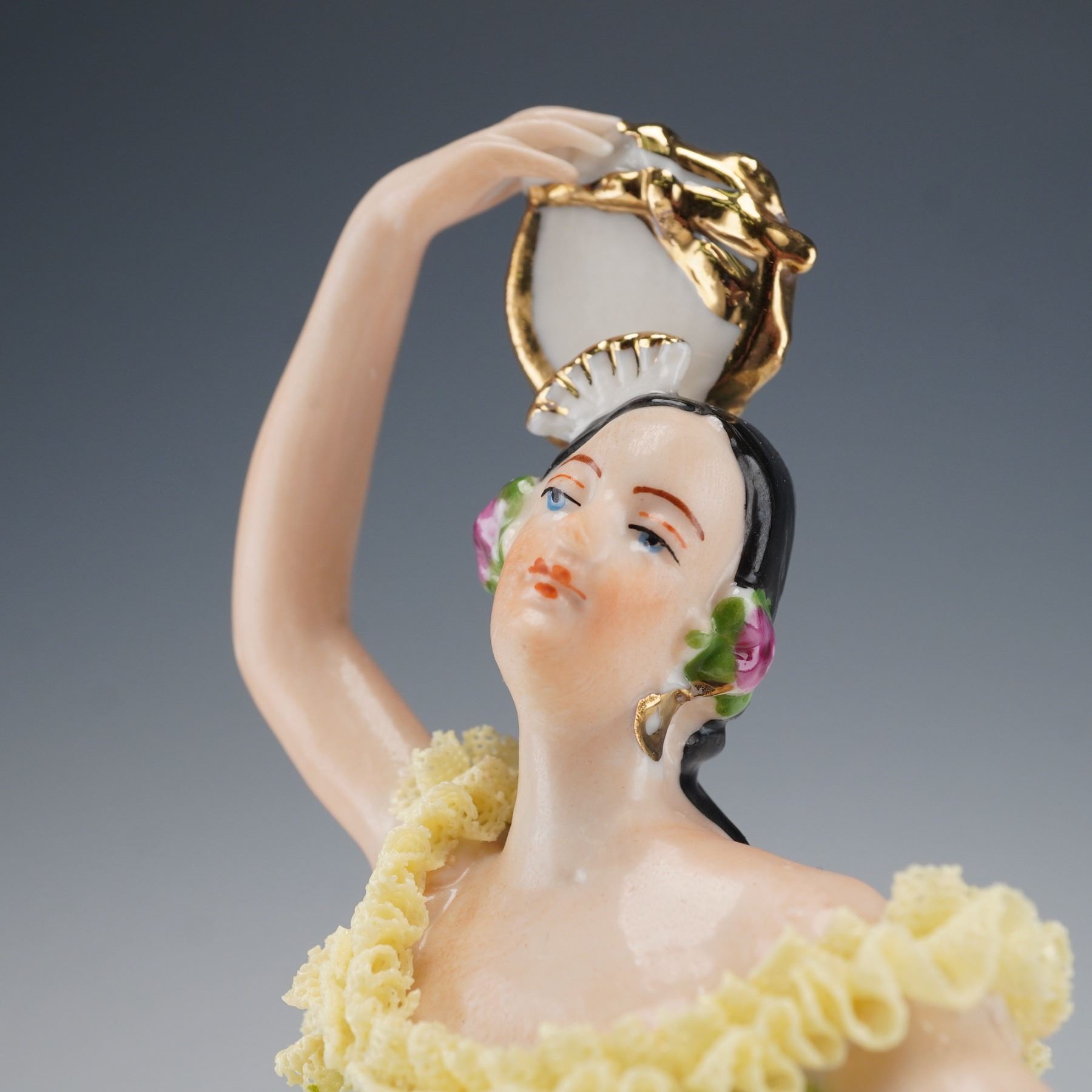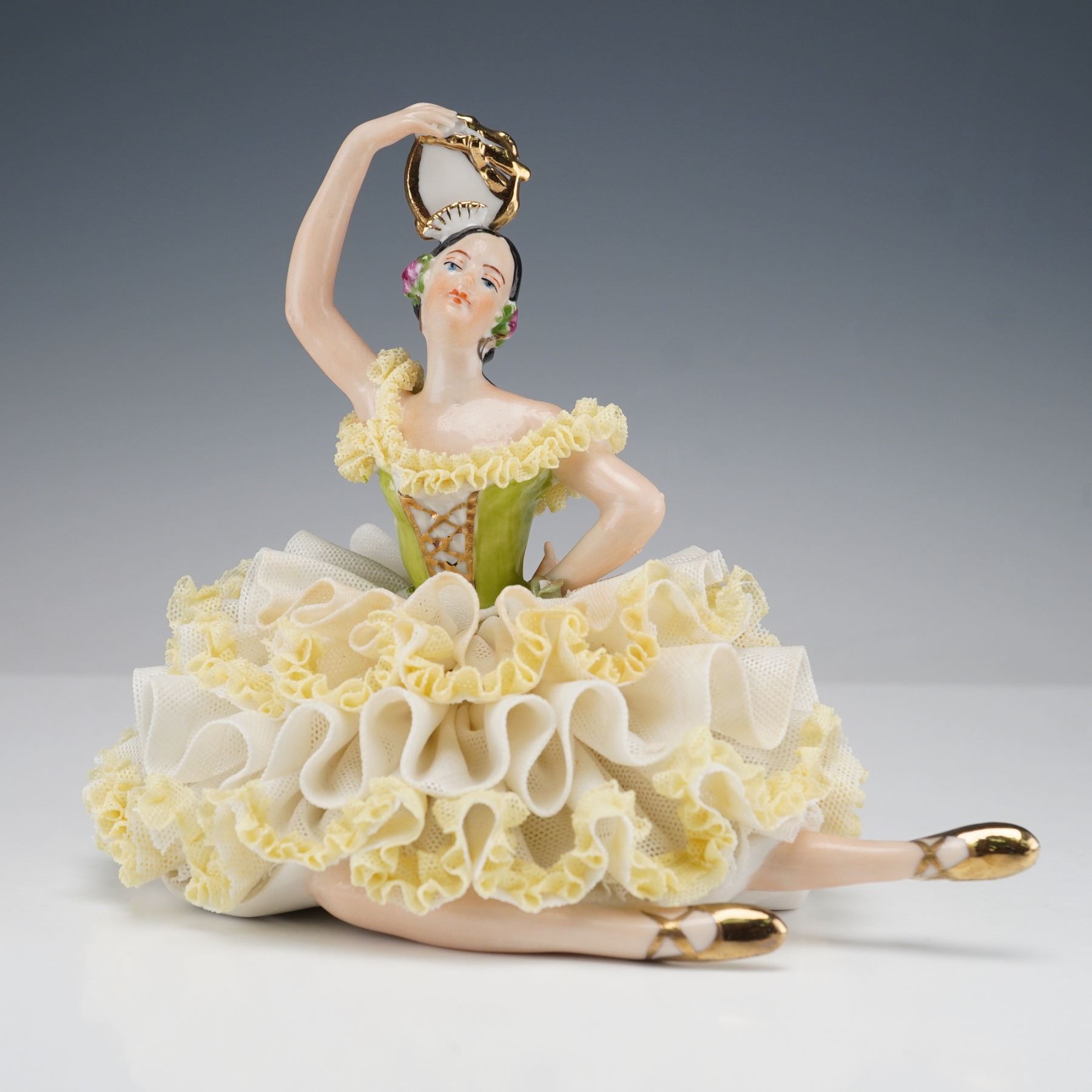 A beautifully detailed lace figurine depicting a Spanish dancer seated gracefully with one arm raised holding a tambourine. She is dressed in a layered gown of yellow and white porcelain lace with a green bodice and gilt ballet slippers. Finely hand-painted facial features, floral adornments, and delicate lacework. Marked with the Dresden Art hallmark with the initials of Wilhelm Rittirsch.