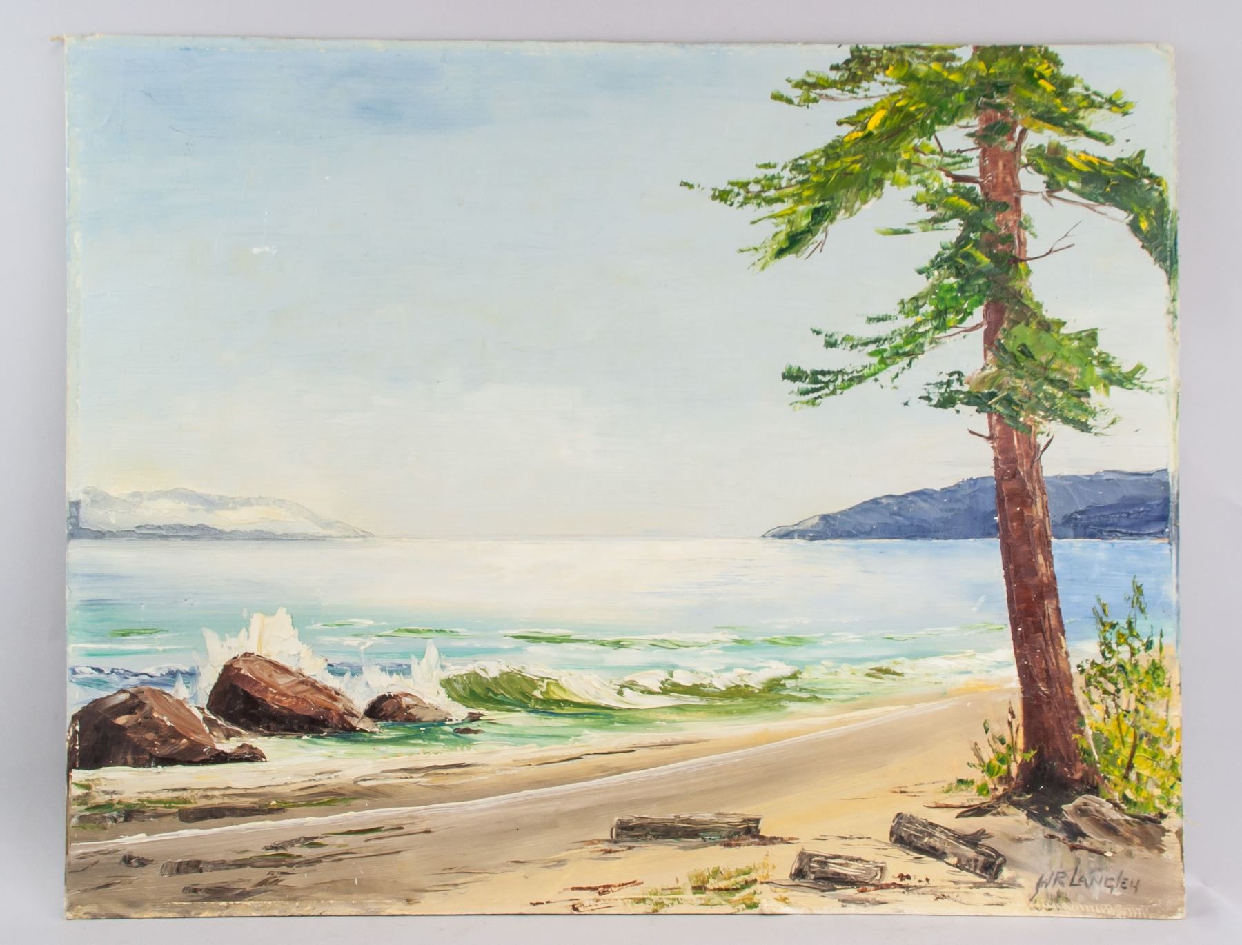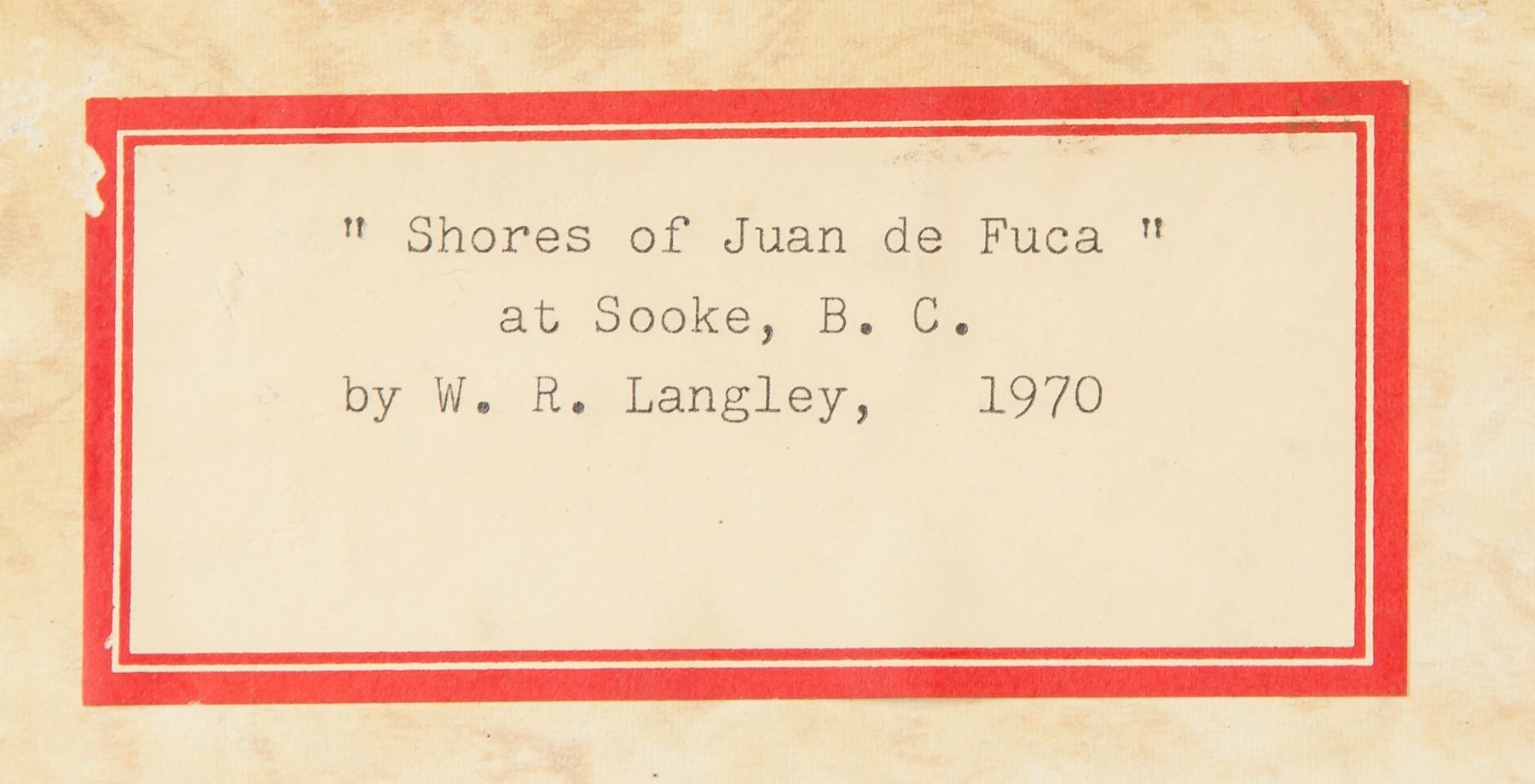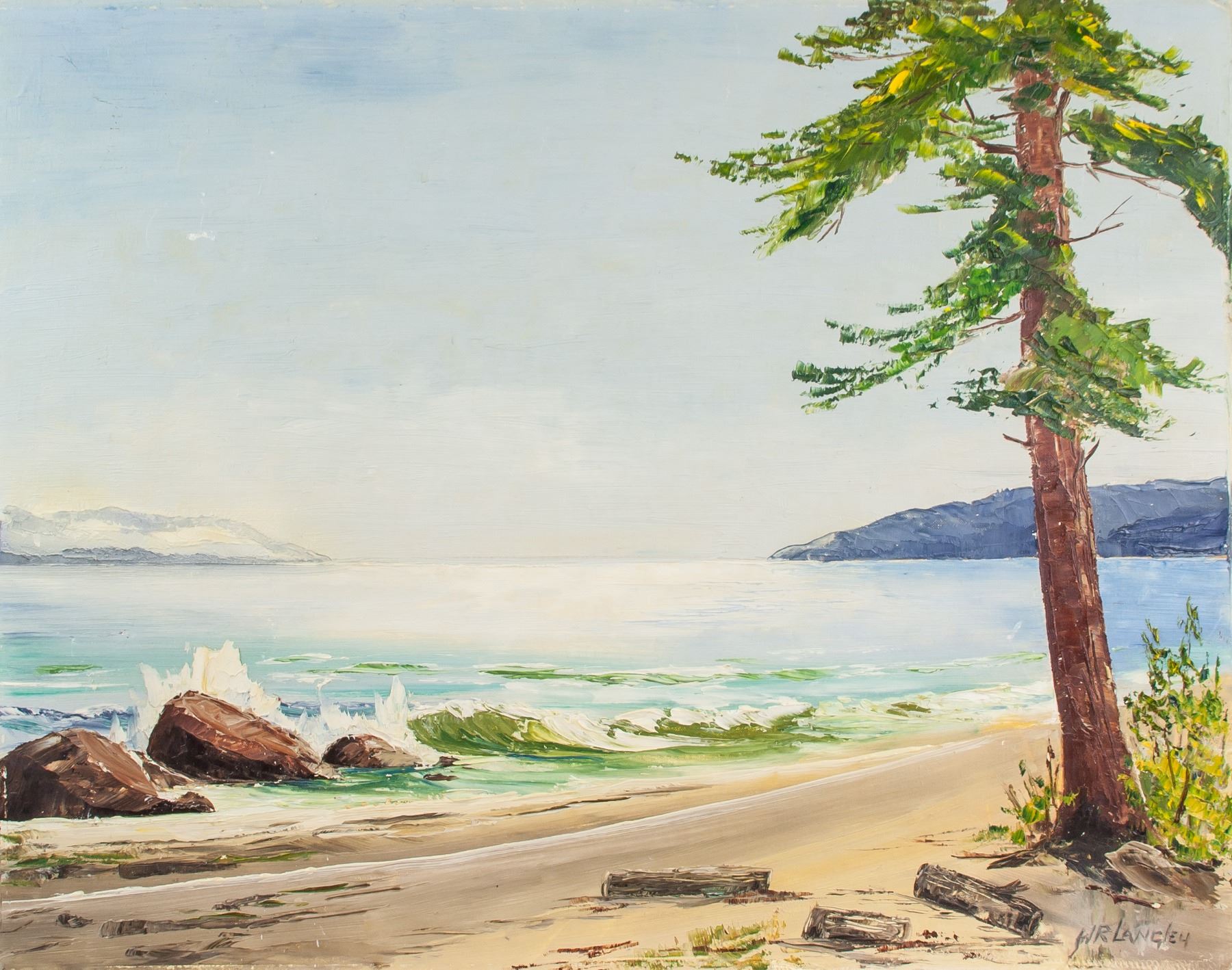 Acrylic on board. Signed WR. Langley. On verso, entitled, "Shores of Juan de Fuca” at Sooke, BC, 1970. 23 x 28.9 in. (58.5 x 73.5 cm)