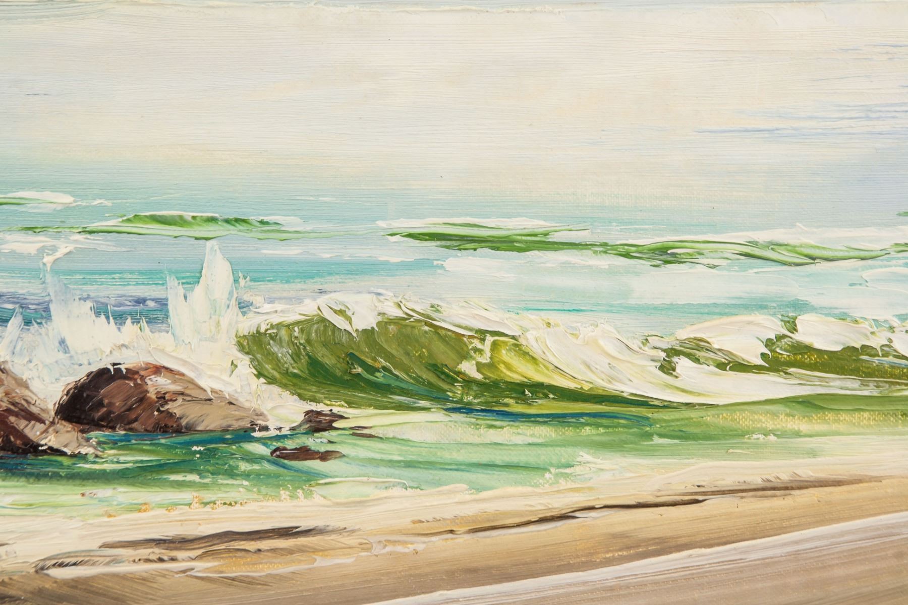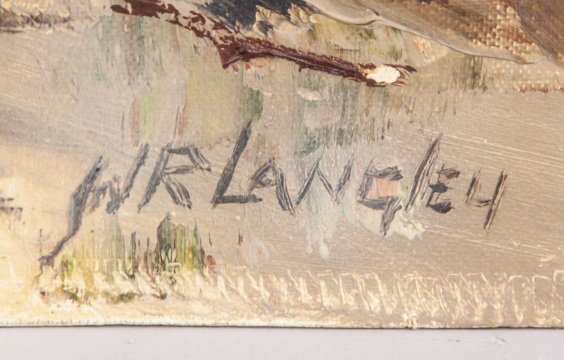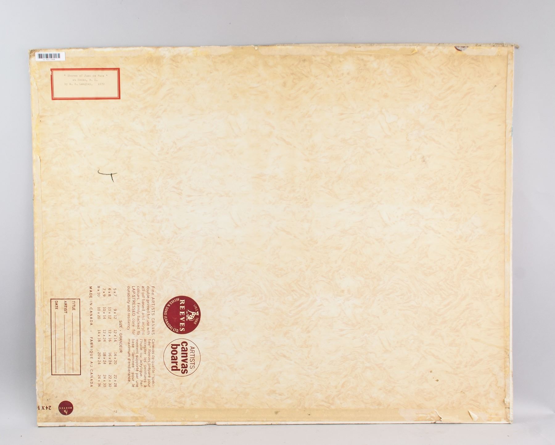 Acrylic on board. Signed WR. Langley. On verso, entitled, "Shores of Juan de Fuca” at Sooke, BC, 1970. 23 x 28.9 in. (58.5 x 73.5 cm)