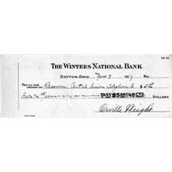 (1871 - 1948) American inventor and a pioneer of flight, Wright, with his brother Wilbur, made the first succesful flight of a motor-driven airplane. Partly-printed D.S. "Orville Wright" 1p. oblong 12mo, Dayton, Nov. 9, 1917, a check drawn on the Winters National Bank & Trust ordering payment of $5.48 to "Receivers Central Union Telephone Co." Four tiny cancellation punches just graze the first letter in signature, else fine condition.