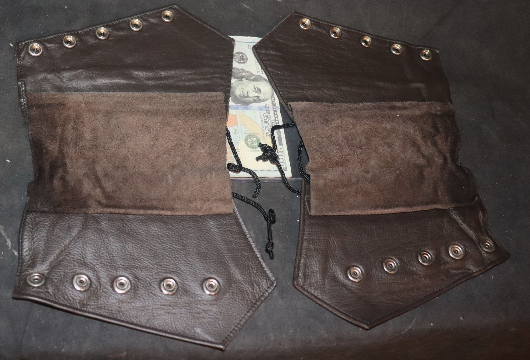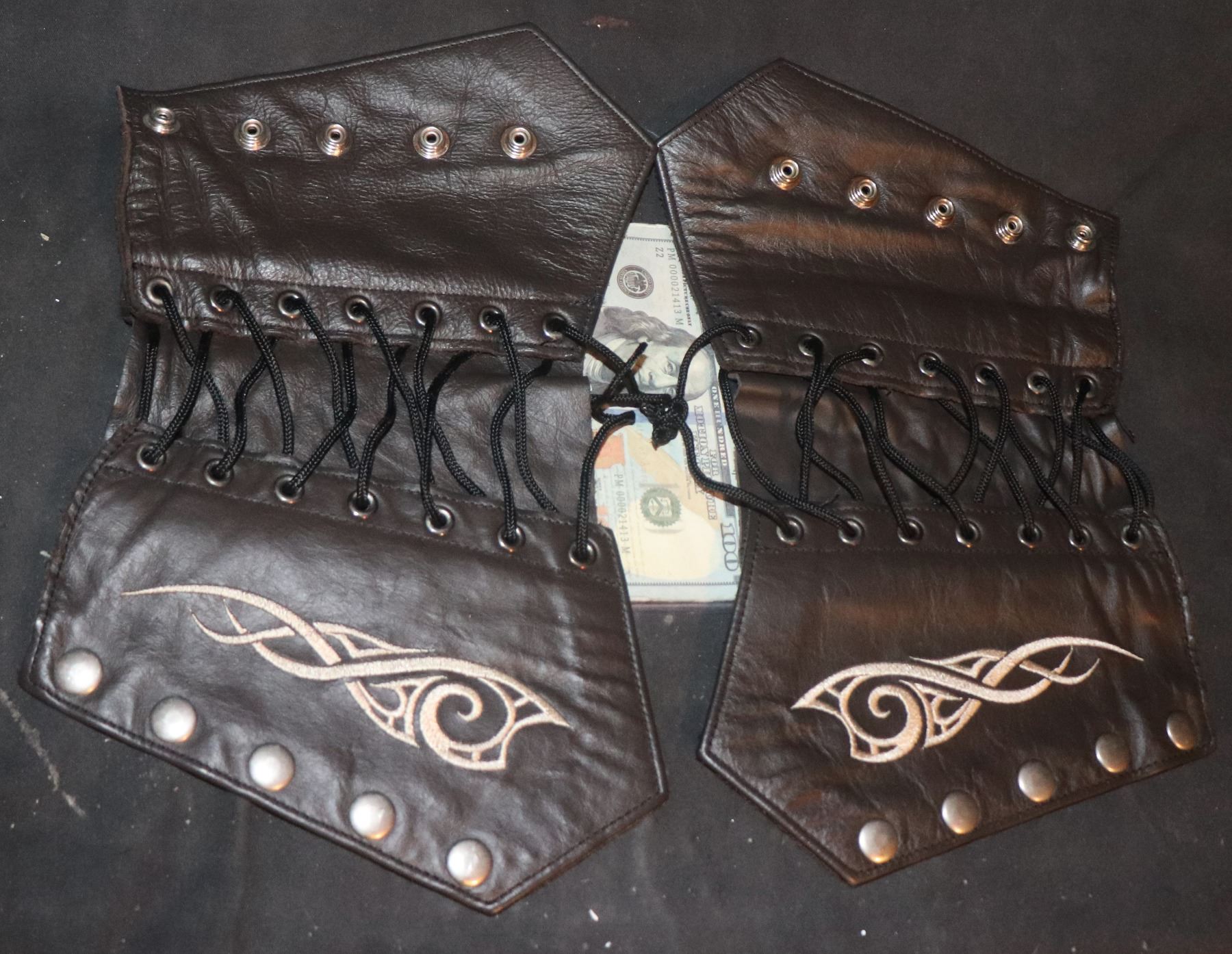 Matched pair, hand tooled leather, Snaps to close but laces to adjust to size!
