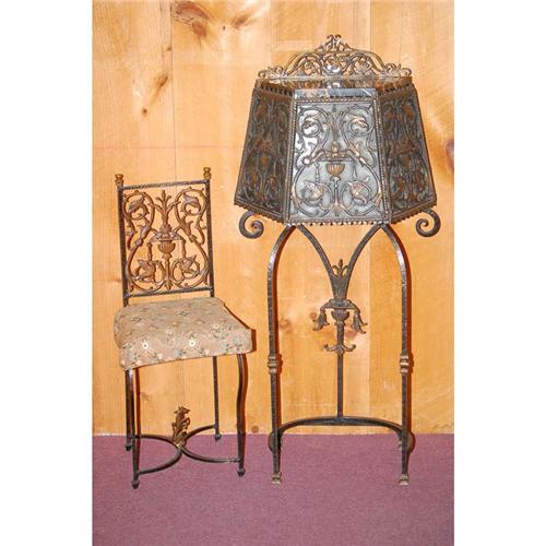 WROUGHT BRASS & IRON TELEPHONE CABINET & CHAIR - BRASS<BR>& IRON CABINET W/ PIERCED BRASS DECORATED PANELS W/<BR>TIN BACK PANELS & MARBLE TOP W/ MATCHING NEEDLEPOINT<BR>SEAT CHAIR (47" T X 22.5" W X 12" D; CHAIR-32.5" T X<BR>13" W & D)-WEAR, OXIDATION, IMPERFECTIONS