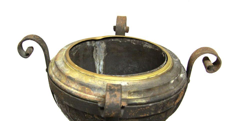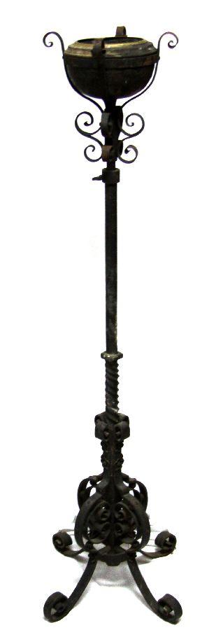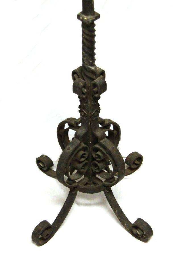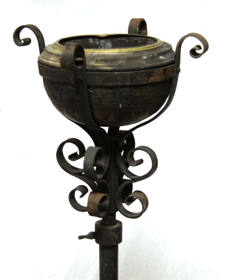 Adjustable from 51 to 63 inches tall. Hand wrought and riveted. Four feet and four arms at top supporting copper fern pot. Very heavy. Some surface rust.