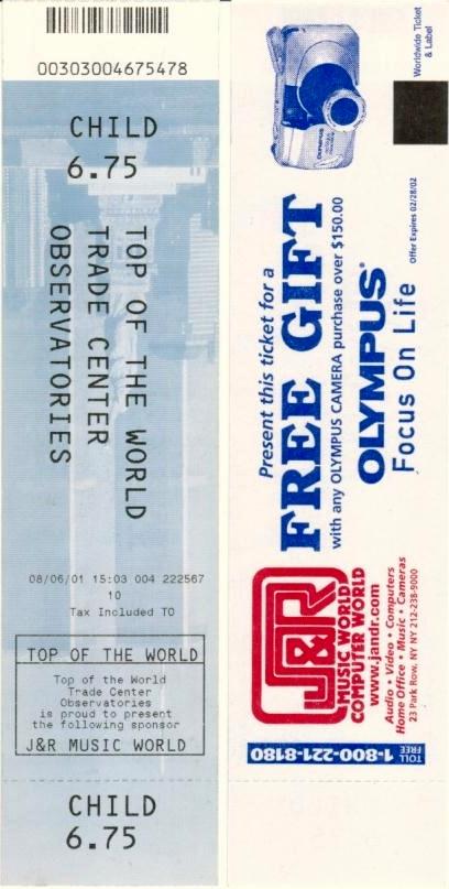 Fine condition, unused ''Child'' or ''Escort'' ticket costing ''6.75'' or ''0.00'' respectively, to the World Trade Center Observatory deck dated 6 August 2001, only five weeks prior to the attack. These 2'' x 8.5'' tickets were printed inside the World Trade Center prior to the tragedy. Olympus ''Focus On Life'' promotion printed on verso. Fine condition.