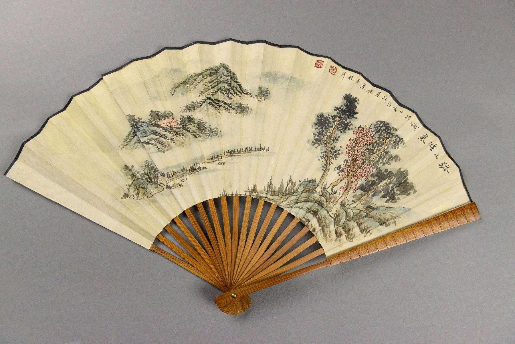 Fan painting with Chinese landscape on front and Chinese script at the back. Signed and attr. Wu Guxiang (Chinese, 1644-1911) with four red seals. Wooden frame carved detailed fruits and blossoms. With one thin hair line crack on frame. 17 x 53 cm. u Guxiang was a Chinese visual artist who was born in 1848. Wu Guxiang has had several gallery and museum exhibitions, including at the National Palace Museum. Many works by the artist have been sold at auction, including 'SET OF 24;SCENERY OF JIANGSU' sold at Sotheby's Hong Kong 'Fine Chinese Paintings' in 2017 for $476,164. The artist died in 1903. PROVENANCE: Private collection (Nagoya, Japan. Circa 2000s)