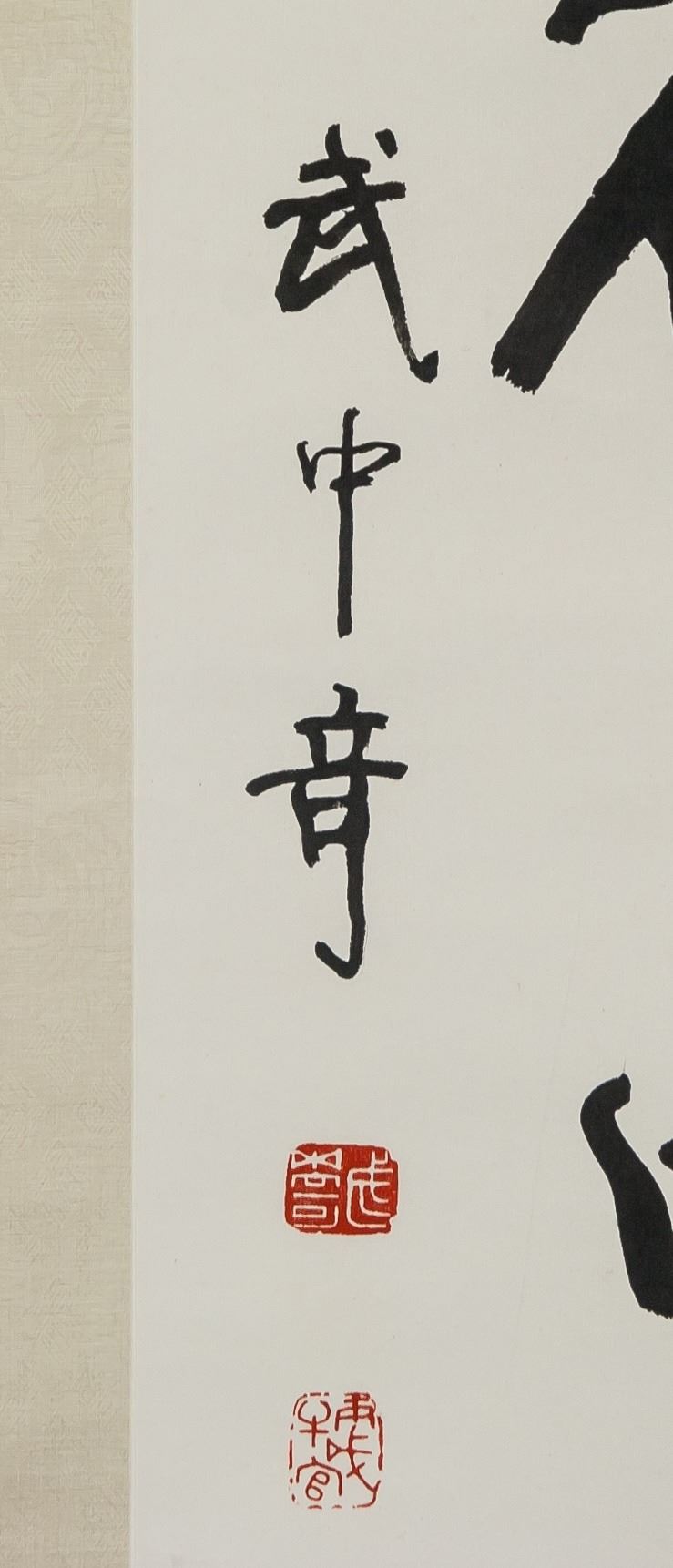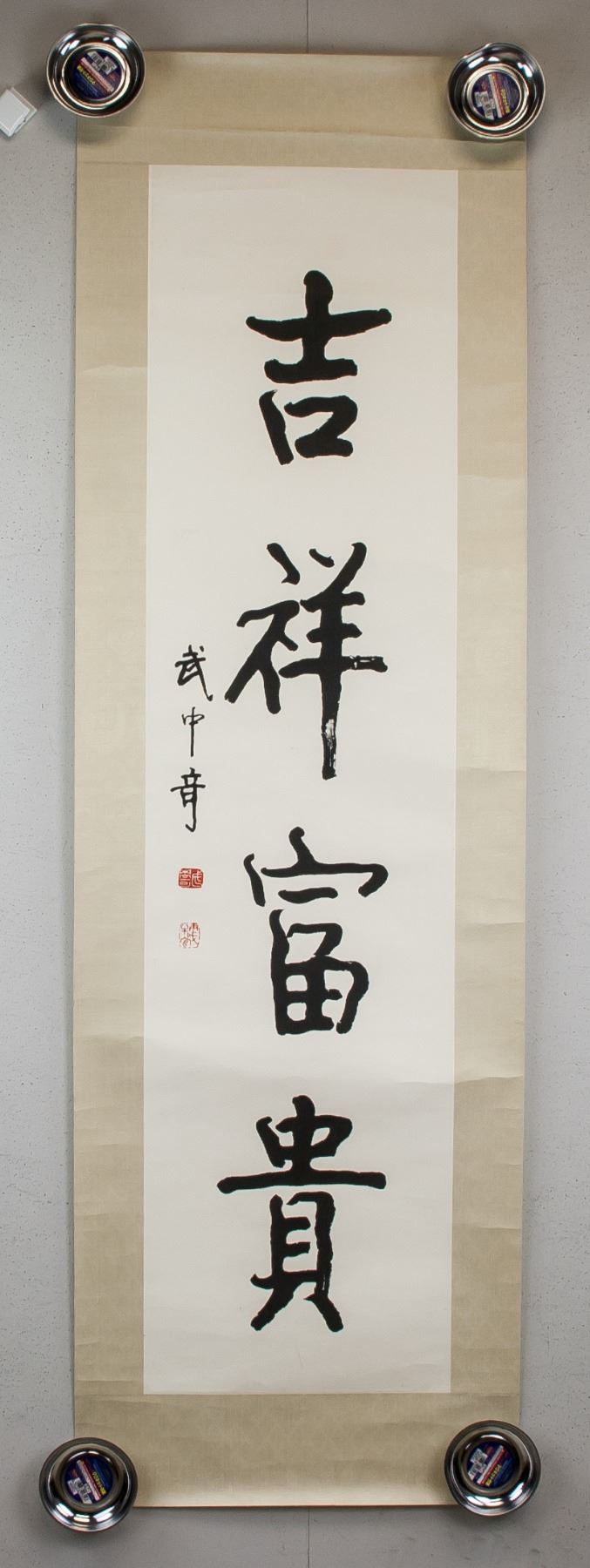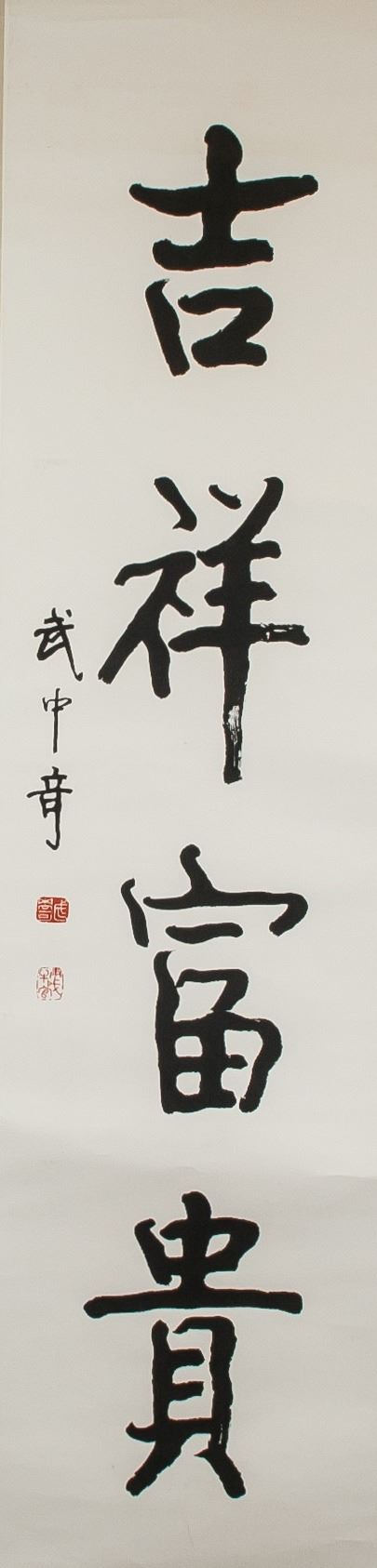 Ink on paper roll, featuring Chinese calligraphy Ji Xiang Fu Gui (auspicious and prosperous), signed and attr. Wu Zhongqi (Chinese, 1907-2006), inscribed with 2 artist seals, 133 x 34 cm. Wu Zhongqi was a Chinese visual artist who was born in 1907. Many works by the artist have been sold at auction, including 'Calligraphy' sold at Poly International Auction Co. 'Modern Chinese Painting & Calligraphy III' in 2015 for $74,121. The artist died in 2006. PROVENANCE: Property of a gentleman (East Toronto, Canada)