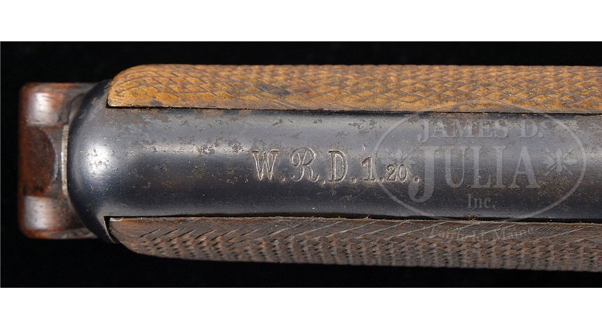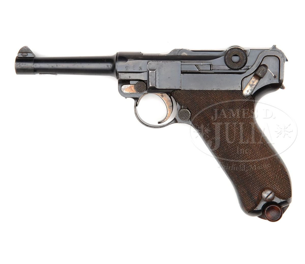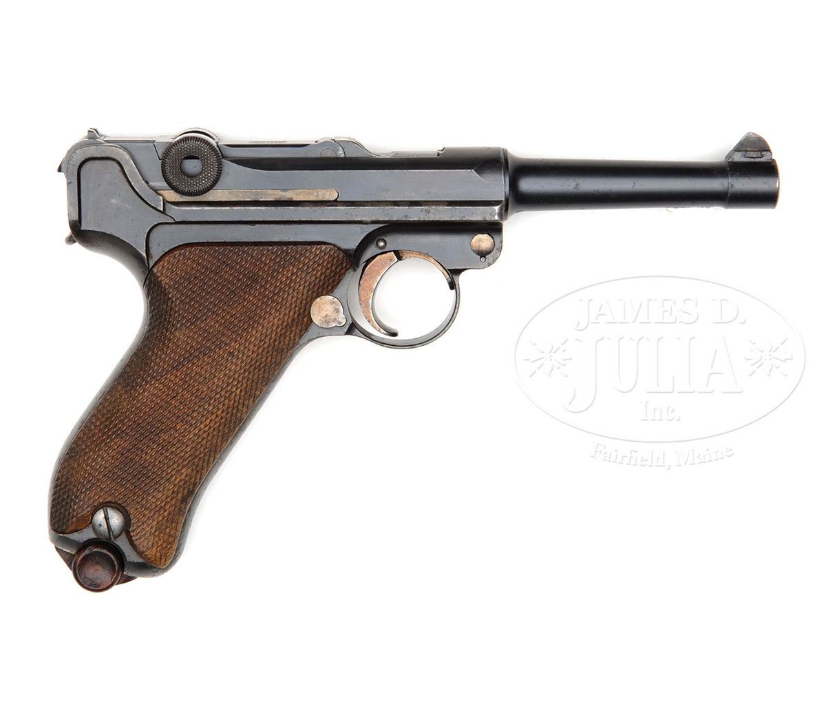 SN 5408. 4" 9mm bbl. "DWM" scroll on center of toggle link. Imperial Proof marks on left receiver. Checkered walnut grips. All numbered parts on the gun are matching except for the left grip. The right grip is unnumbered. Holdopen added, no stock lug, undated receiver. The proper 1908 magazine with large vertical numbering does not match. Front grip strap is unit marked "W.R.D.1.20." (Wurttembergische Reserve Dragoner Regiment, 1st Eskadron, Weapon Number 20). This gun is featured on pp. 483, 717, and 1151 of Dr. Geoffrey Sturgess' The Borchardt & Luger Automatic Pistols. PROVENANCE: Collection of Dr. Geoffrey Sturgess. CONDITION: Fine. Retaining 95% orig blue and 60% orig straw with scattered light pitting overall and some browning to the grip straps. Bore is lightly frosted. Grips are lightly worn with some minor indentations. Magazine is excellent. Mechanics are sound. 4-52918 BWS50