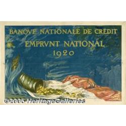<B>Banque Nationale De Credit (Devambez Paris, 1920)</B></I> WW I Poster (22" X 47"). Born and raised in Italy, Leonetto Cappiello (1875 - 1942) moved to Paris and became one of the most noted poster designers for the first part of the 20th Century. He is best known for his colorful advertising posters, but here he lent his talents to a national cause, a 1920 French loan drive launched to pay for debts brought on by the First World War. Very Fine condition on Linen.