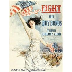 <B>Fight or Buy Bonds (Forbes, 1917) WW I Poster (40" X 60")</B></I>. One of the more famous and powerful WWI propaganda images, this flag-waving Miss Liberty poster is unusual in that it urged both recruitment and bond sales. The United States had just entered the war when this poster appeared and it is one of the earliest examples of myriad illustrations that were used to motivate both troops and the American public. Its designer, Howard Chandler Christy (1873 - 1952) was at the height of his fame. He earned his spurs as a wartime artist when he accompanied U.S. troops to Cuba in 1898, an experience that stood him in good stead when he was called on to create his famed series of patriotic WWI posters. Most WWI posters were issued in several size formats.The 30" X 40" style is also in this sale. Fine- condition on Linen.