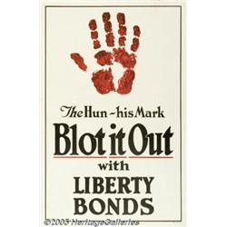 <B>The Hun-His Mark Blot it Out (Brett Litho, 1917)</B></I> WW I Poster (27" X 42"). This famed bloody handprint image was by James Allen St. John, who was to become well known for his later illustrations in pulp magazines, especially those with a fantasy and mystical theme. His original oils in that genre are quite sought after. Very Fine condition on Linen.