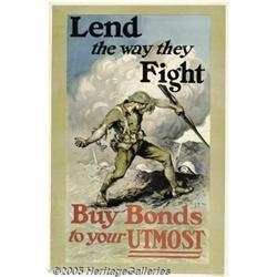 <B>Lend The Way They Fight (W.F. Powers Litho Co., 1918)</B></I> WW I Poster (27" X 41"). Doughboy bayoneting German offstage right with grenade in left hand, German helmets below. The poster designer, E.M. Ashe (1867 - 1941), was noted for his industrial paintings, especially of steel mills. Through his friendship with Teddy Roosevelt, he became an artist in residence at the White House. This is his only known WW I poster. Fine+ condition.
