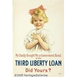 <B>My Daddy Bought Me a Government Bond (United States Printing and Lithograph Co., 1918)</B></I> WW I (20" X 30"). Depicted: Smiling young girl, with ribbon in her hair, who is clutching a government bond. Poster artist Henry Raleigh was born in 1880 in San Francisco and drew illustrations and covers for the Saturday Evening post and Cosmopolitan. Lower corners have some crumpling and slight paper loss. The poster is in overall excellent condition. Very Fine+ condition.