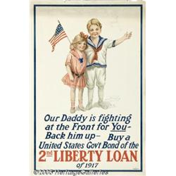 <B>Our Daddy is Fighting at the Front for You - Back Him Up (T.F. Moore Co., New York, 1917)</B></I> WW I Poster (20" X 30"). Depicted: Young boy (in sailor suit) and girl; boy holds a U.S. flag. Little is known of the artist for this poster other than his name is Dewey, but it is credited as being extremely effective in raising funds for the war effort. It was released as part of the 2nd Liberty Loan Campaign of 1917. Some crumpling at the top border and minor staining on the upper third of the poster. The piece overall is in terrific shape. Very Fine condition.