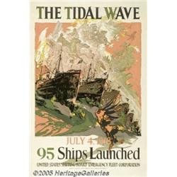 <B>The Tidal Wave (Thomsen-Ellis Corp., Baltimore-New York, 1918)</B></I>. WWI Poster (20" X 30"). Ship launch July 4, 1918. Prefiguring the giant armada of naval ships produced in WWII, this image was created to reassure a jittery American public about the success of the war effort. It's designer is Joseph Clement Coll (1881 -1921), a prolific magazine illustrator who was one of the earliest to work in the new medium of unengraved drawings. His thousands of illustrations in a host of periodicals is said to have had a profound influence on the pulp magazine artists of the 1930s and 40s. Fine/Very Fine condition on Linen.