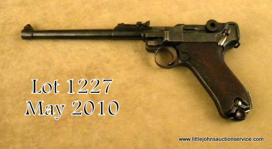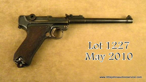 WW I era German Luger semi-auto pistol, by DWM dated 1916, 9mm cal., 8” barrel, fine tuning front and rear sights, original blue finish, checkered wood grips, #7158. The pistol shows approx. 80%-90% original blue finish, some losses at highpoints, edges and gripping areas from normal military handling and use; some scattered light to moderate erosion and pin prick pitting; all in the normal areas of the muzzle, contact points, etc.; all matching visible serial #s; good sharpmarkings, correct WW I period wood bottom clip that does not match. The grips are good with some staining and small losses; the bore is bright. An above average Artillery Luger with desirable sights and that would improve significantly withthe addition of a holster and stock which are featured at other lots in this auction. Est.: $1,500-$3,000.