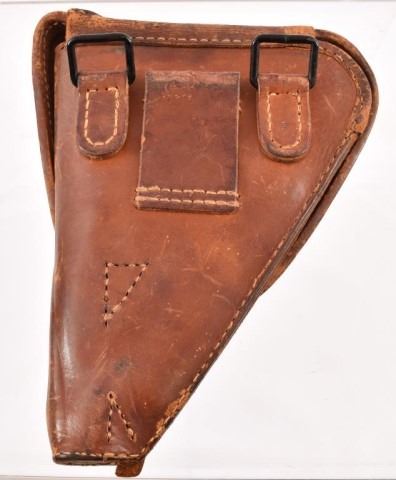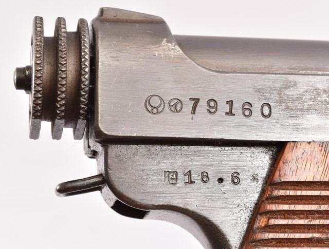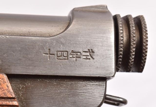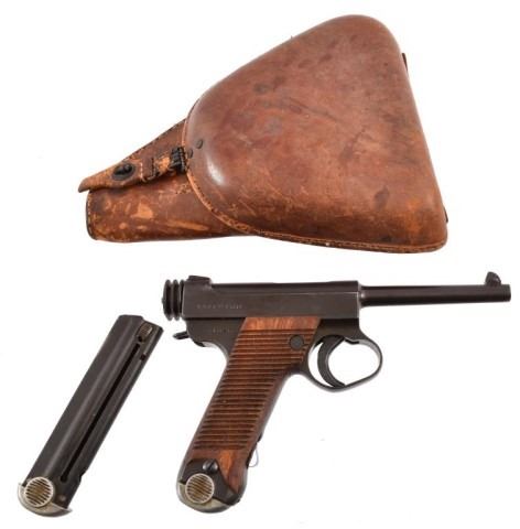 * Nambu M-14 8mm pistol with leather holster. Nagaya manufactured 6-43. 4.5" barrel. Serial no. 79160