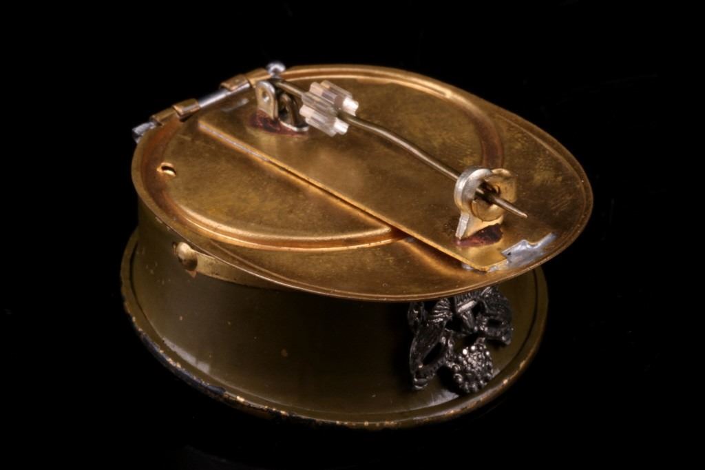 Offered in this lot is a WWII military officer's cap locket style brooch with military canon insignia on the top and eagle insignia on the front. This is a classic example of WWII sweetheart jewelry that is done in brass and khaki green enamel. The brooch opens at the front of the cap to reveal a place to insert a round photo of your loved one. It is in good condition; however, there are signs of wear, which is to be expected given its 1940s age. The brooch measures 1 3/4" from front to back and is 1 3/8" round at the top with a height of 3/4".