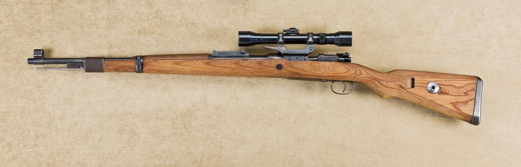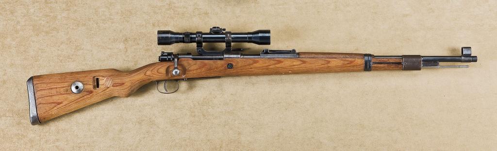 WW II bring back Mauser arsenal produced SS Model 98k Sniper bolt action rifle, 7.92mm cal., 24” round barrel, military finish, wood stock, #046. This gun is in overall very good condition showing the majority of its military finish on metal parts, very good bore, crisp action, sharp markings, some mixed numbers on small parts, hooded front sight and adjustable rear sight; cleaning rod retained; very good wood stock with checkered metal butt plate; correct off-set Hensoldt-Wetzlar scope, 4X, #4343 in overall very good condition with very good optics. Another hard-to-find Sniper rifle in any condition with this being one of the better ones we have seen in some time. Est.: $3,000-$6,000.