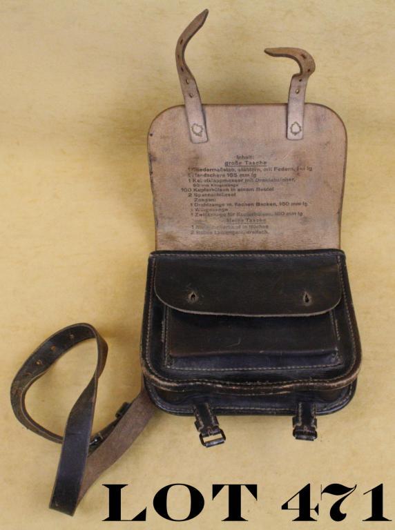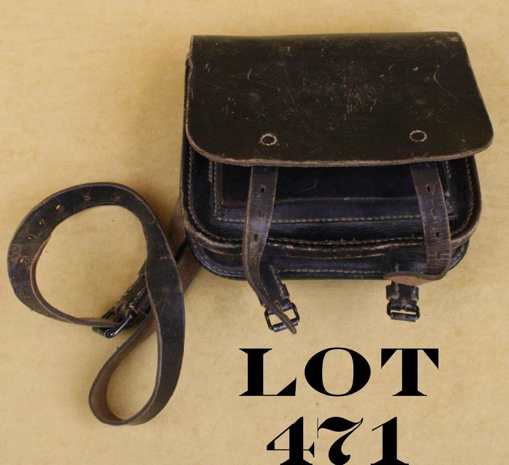 WW II era black military shoulder bag for ammunition and documents, approx. 8” by 9” with flap that is secured by two straps and buckles; carry leather strap intact, in overall good to very good condition withscattered scuffs and wear from carry and storage; interior is in very good condition and has approx. 95% of the German instructions remaining on the underside of the cover flap. Est.: $75-$150.