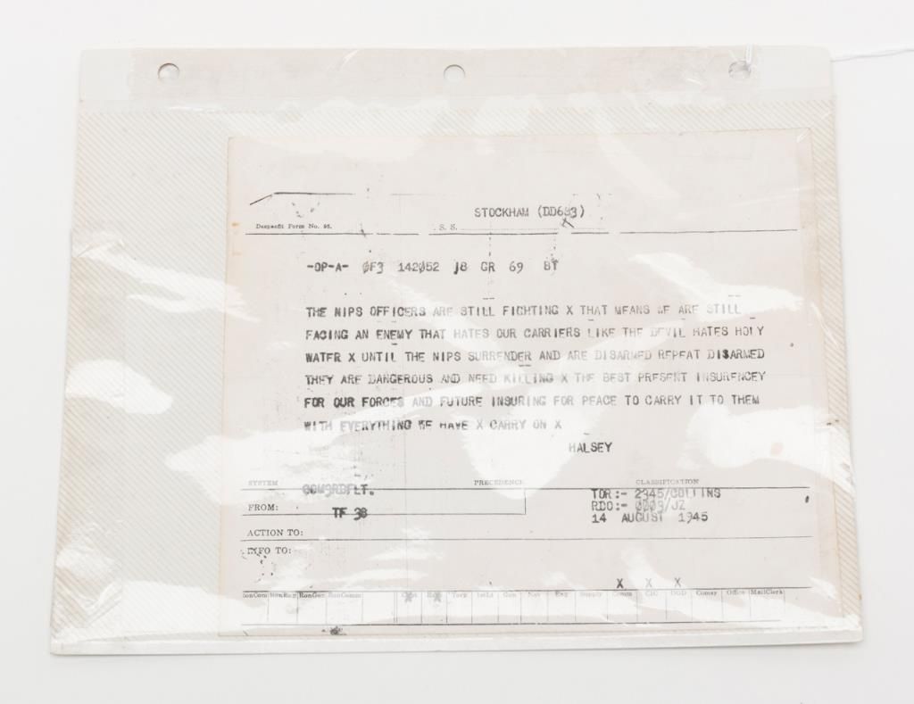 WW II teletype dispatch dated 14 AUGUST 1945 from Admiral Halsey reminding Naval forces at the closing days of the war, to continue to be vigilant and fight on aggressively against the Japanese until surrender is accomplished. Est.: $50-$100.
