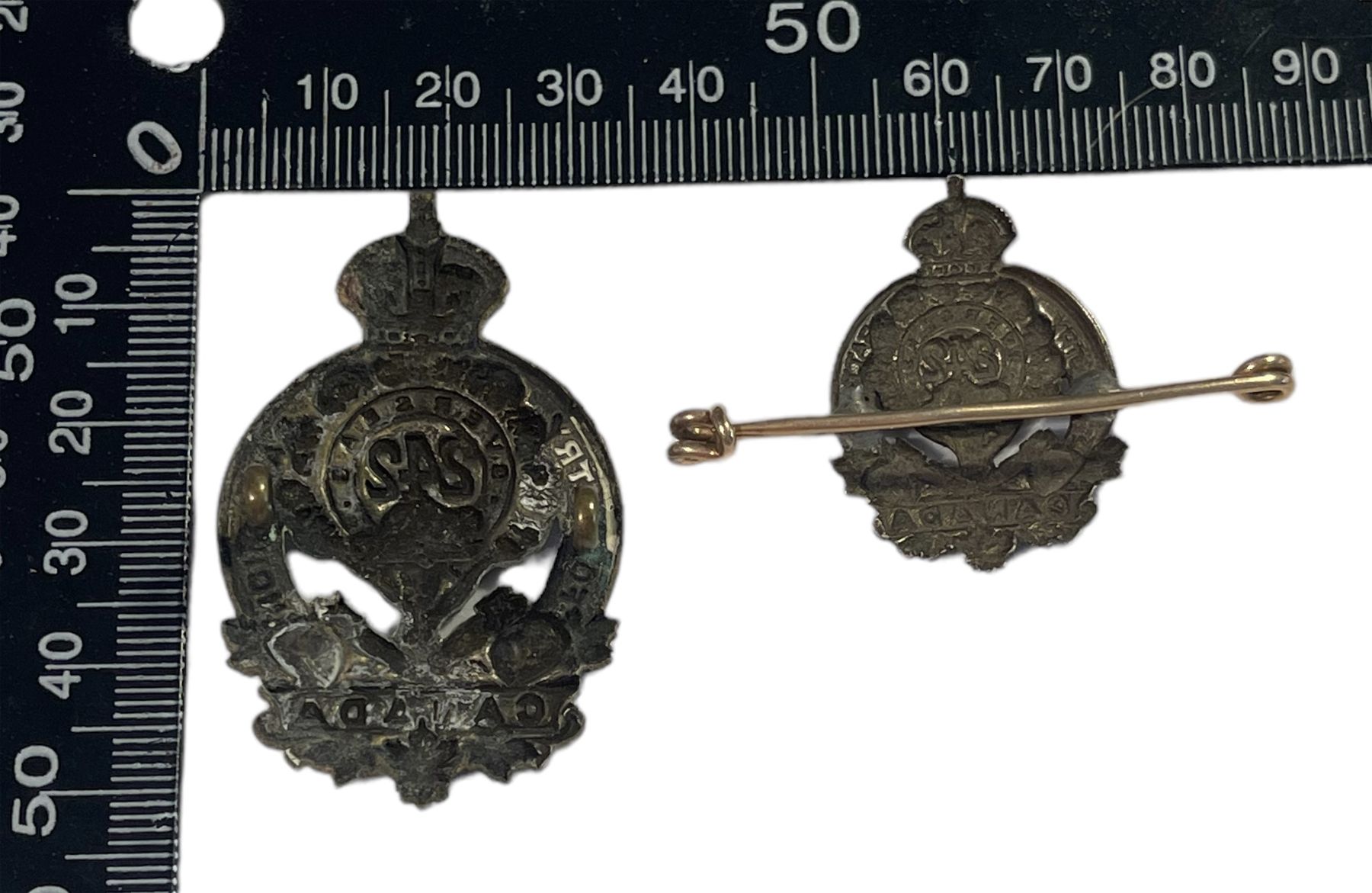 Lot of 2. Cap badge in antiqued brass, sweetheart is a silver or silver plate collar mounted on brooch fastener. Cap with lugs.