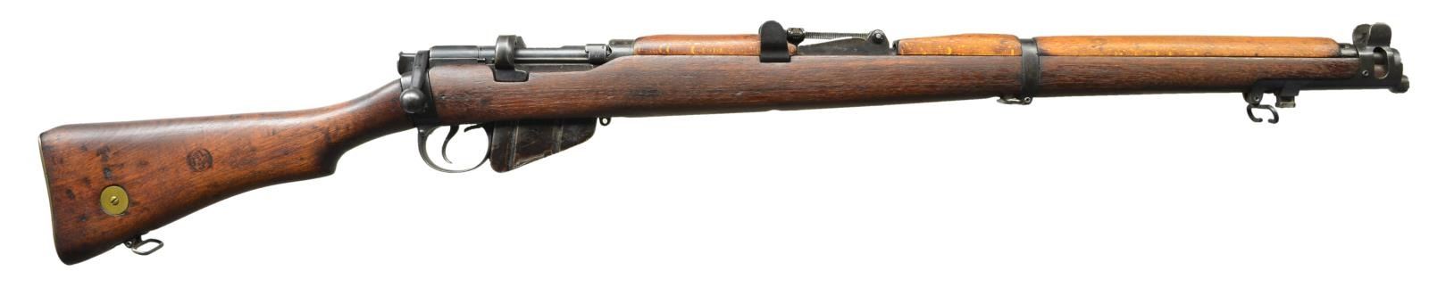 Cal. 303 Brit. S# D80084. Bbl. 25 1/2". Arsenal renumbered matching numbers on bolt & nosecap. Other parts unnumbered or mismatched. Receiver ring marked "ENGLAND". Right side of socket marked w/ British proofs, BSA marking, 1917 date & SHTLE III* marking. Ladder rear sight graduated to 2000yds. Blade front sight w/ protective ears. Hardwood stock set w/ beech handguards. Right side of butt has Indian post independence cartouche. Sides of rear sight have had handguards armorer removed. Bottom mounted sling swivels. MAGS: 1-10 rd. detachable unnumbered. CONDITION: sanded stock set has two armorer reinforcements on rear handguard, some scattered dings & handling marks. Metal retains 60% arsenal reworked blue w/ scattered fading to brown. Very good bore. (22-3624/MJC). CURIO. $500-850.