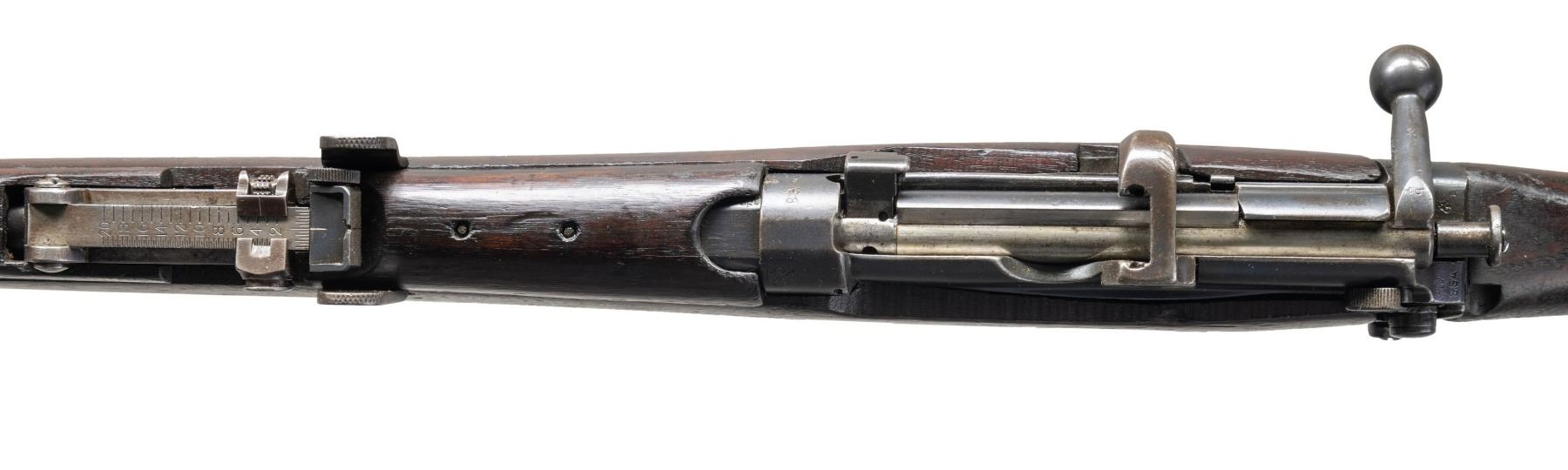 Cal. 303 Brit. S# S4997. Bbl. 25 1/5" dated 1916 & marked with British sale proofs under rear of handguard. Standard SMLE MKIII sights. No legible forend number present but other parts are matching to receiver with rear sight being arsenal force matched. Early SSA "Peddle Scheme" rifle. Right side of socket marked "(Crown)/GR/1916/SHTLE/III*". Rear left of socket marked "SSA" for Standard Small Arms. Arsenal rework blued finish. Hardwood stock set with bottom mounted sling swivels. Handguard has a portion removed around rear sight base on both sides. Stock disc has markings that appear to be Farsi or Arabic. CONDITION: stock set has arsenal rework appearance with added oil finish, some gouges, scattered dings, handling marks & scratches. Socket displays a loose metal fit. Metal otherwise retains 30% arsenal blue with overall fading, some pitting on socket, scattered oxidation, edge & handling wear. Action functions properly when hand cycled. Fair bore with scattered frosting & light pitting but good rifling. (25-2840/MJC). CURIO. $300-500.