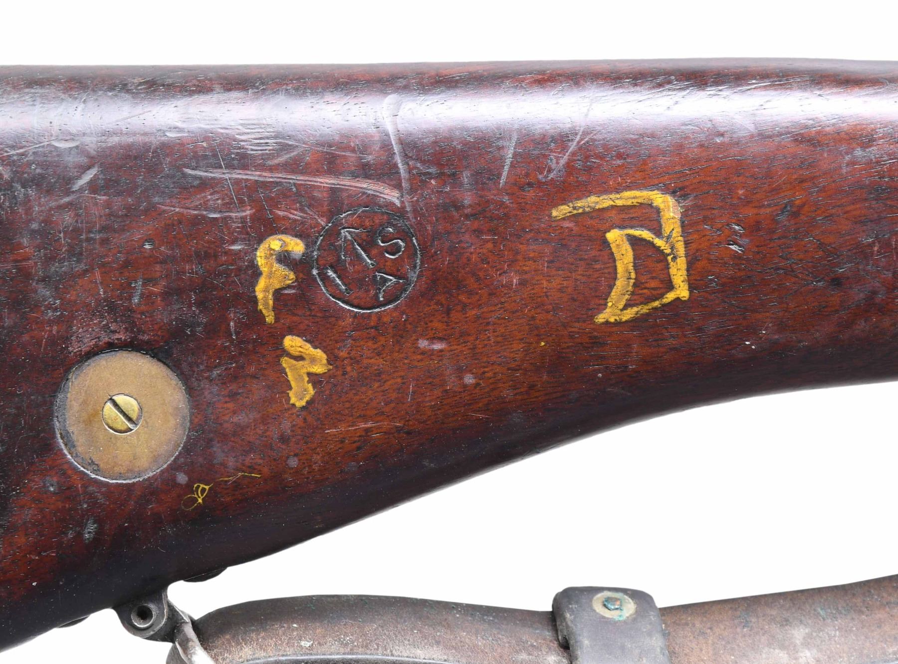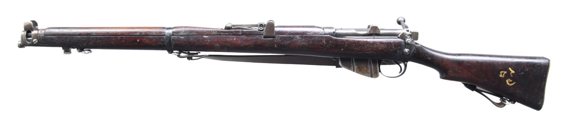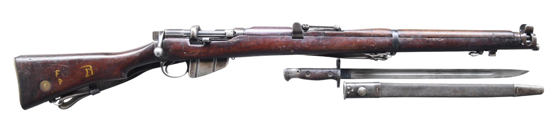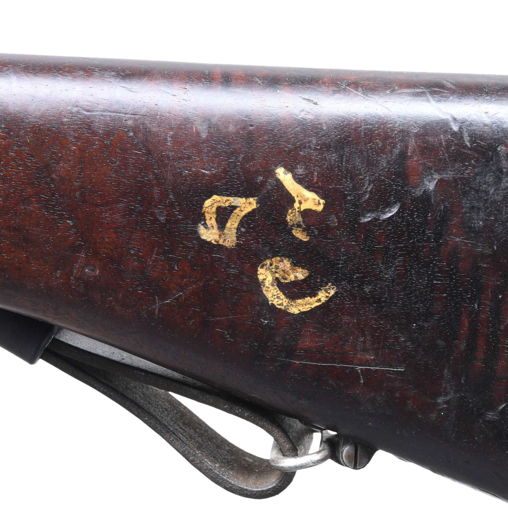ACTION RIFLE. Cal. 303 Brit. S# G5805. # matches on receiver, rear sight and bayonet lug. Bbl. 25". Tangent rear sight graduated to 2000 yards. Blade front sight with protective ears. Receiver is marked on left side of butt socket "CROWN GR/ ENFIELD/ 1914/ SHTLE/ III". Marked on lower left side "F broad arrow R/ 1932" indicating a factory repair in India. Magazine cut off is present. Nose cap has bayonet lug and stacking swivel. Walnut stock set. Buttstock w/ brass trap buttplate is marked on top "S". The right side has encircled "I arrow SA" Indian independence marking. Unmarked brass disk. Both sides have oriental characters in yellowing white paint. Correct unmarked brown leather sling. MAGS: 1-10 rd. detachable. UNNATTACHED ACCESSORIES: Model 1907 bayonet w/ 17" fullered blade. Marked on right ricasso "1907 SANDERSON". Right ricasso has view marks "23 broad arrow and X". Smooth Walnut grips secured by 2 screws. Unmarked black leather scabbard with metal throat and tip. Bayonet has moderate wear turning grey and patina. Scabbard has wear scuffing and staining. CONDITION: stock set has the expected wear, staining and handling marks from long hard service. The metal is turning grey and patina with moderate wear. Bore has moderately worn lands but remains shiny. (25-993/RW). CURIO. $400-600