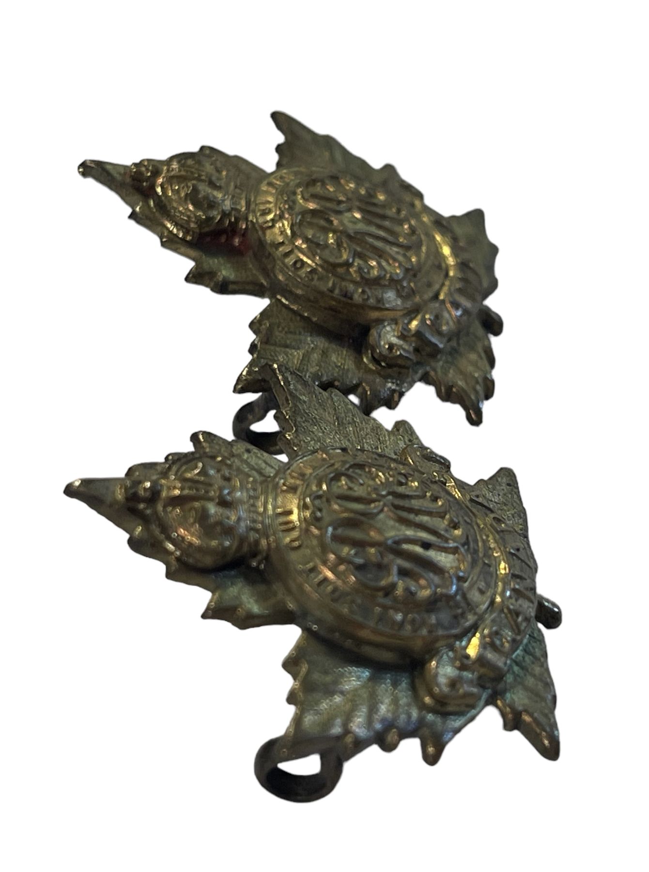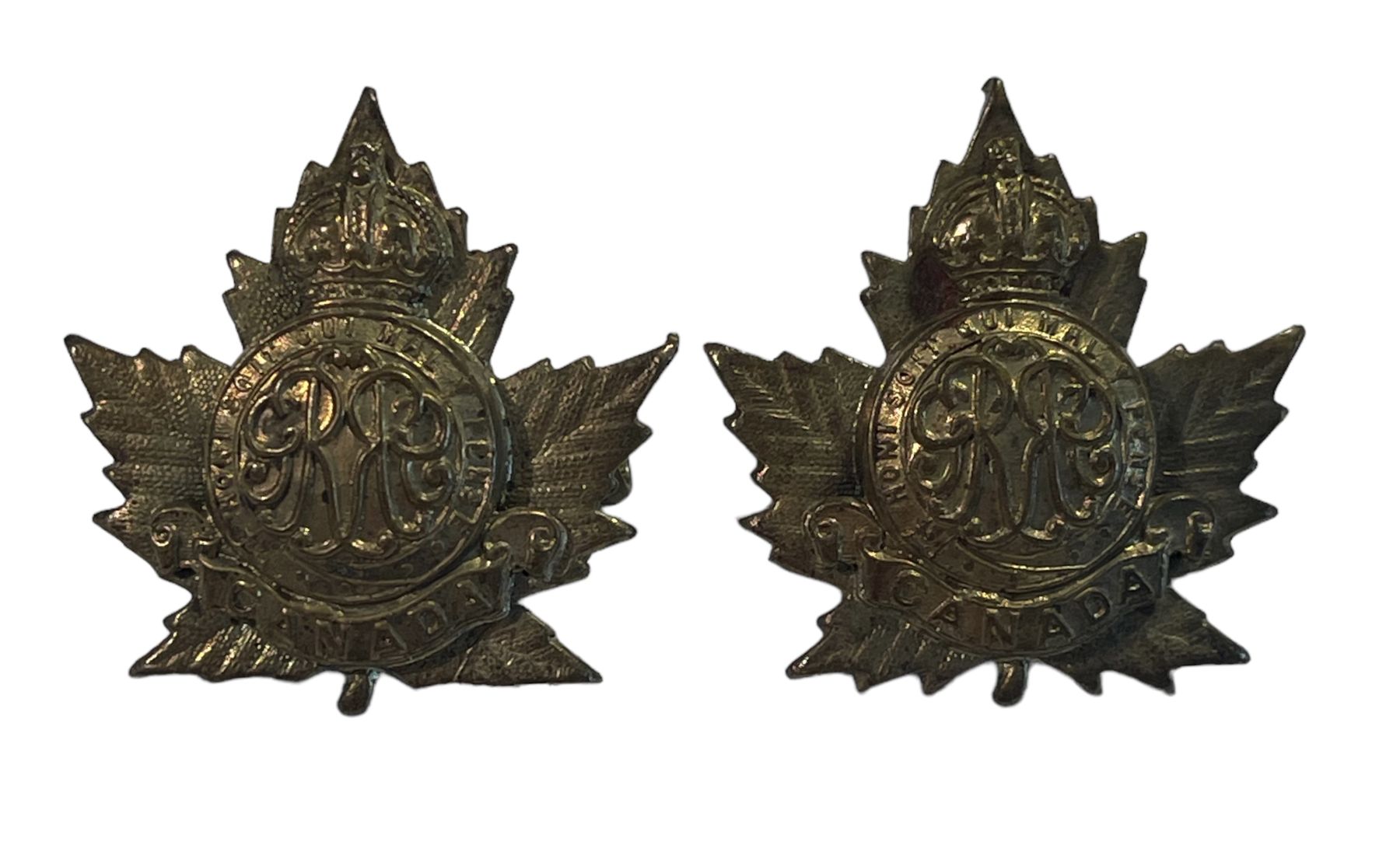Lot of 3. Cap badge is a two piece Officers issue, in age toned gilt metal, collars are also two piece construction in brass. Lug fasteners on all.