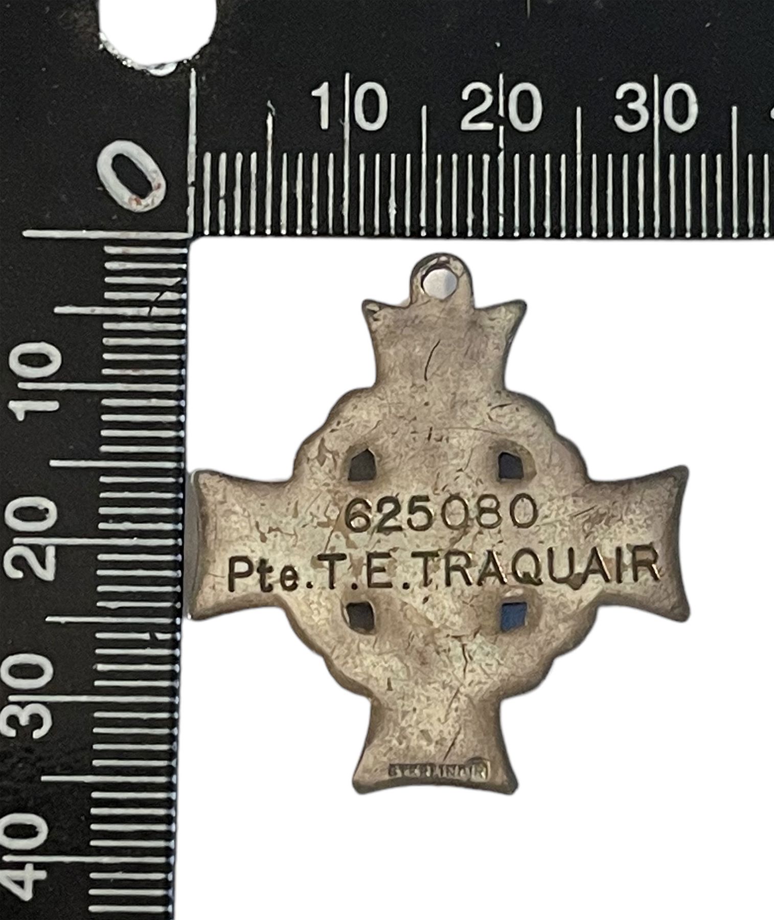 Lot of 1. 625080 Pte. T.E. TRAQUAIR. With ribbon and case. Discharged as unfit, and must have died of wounds sustained during service after being released. Unfortunately the suspension ring is missing.