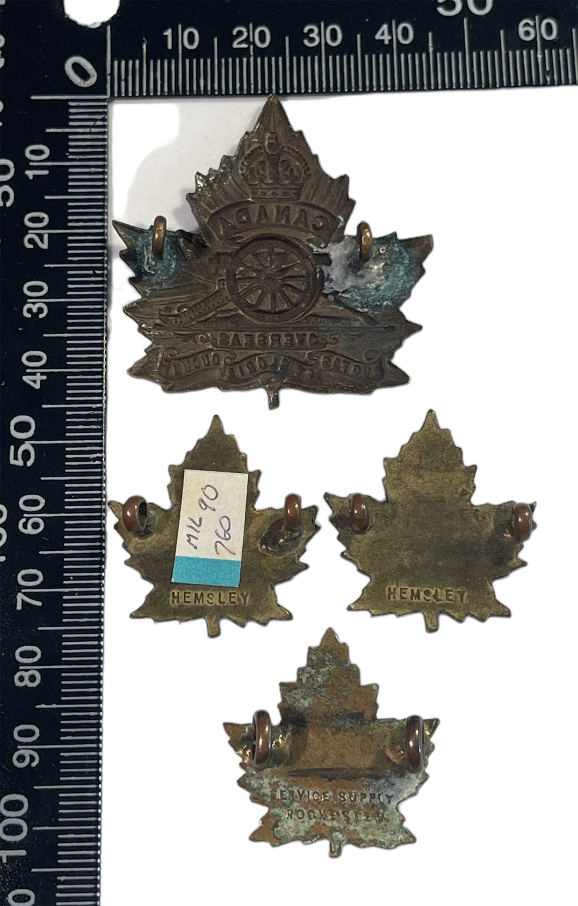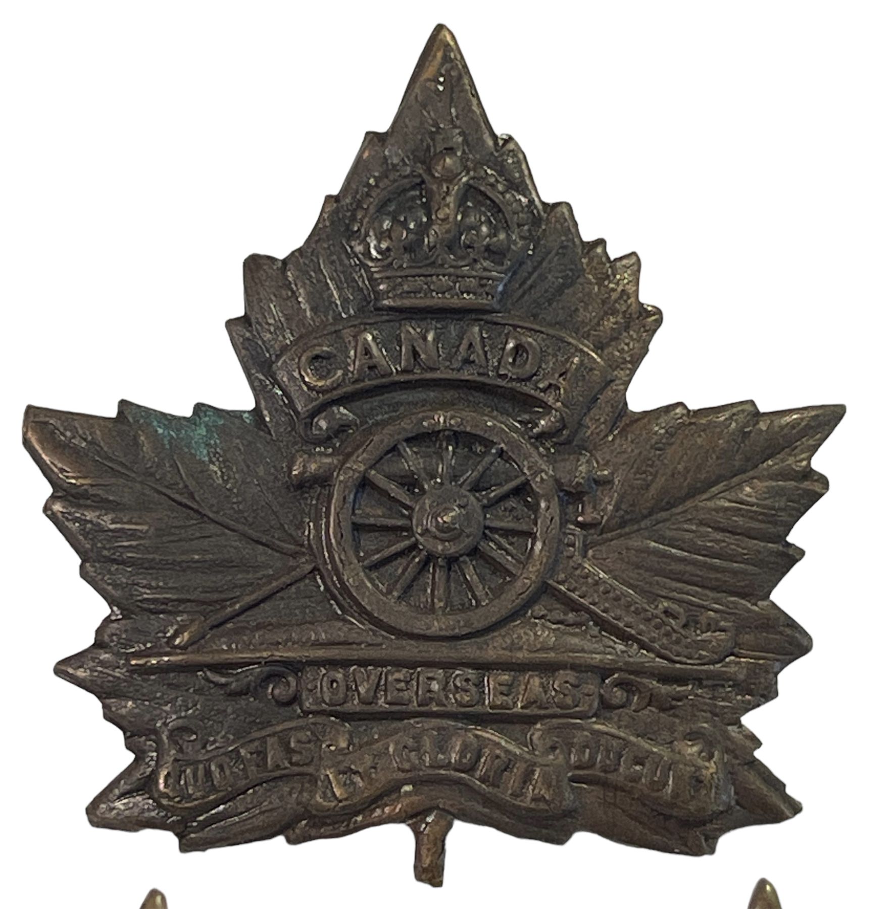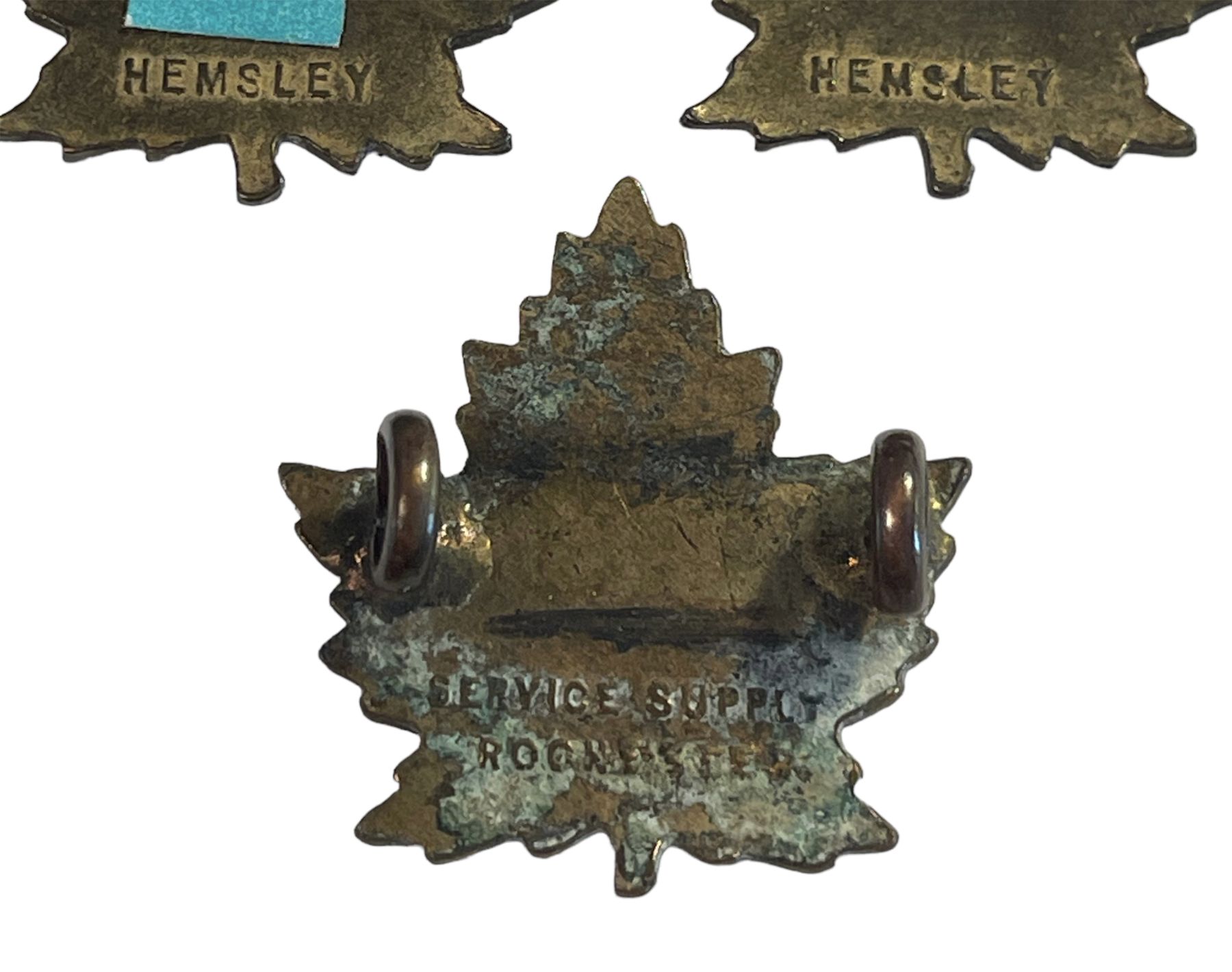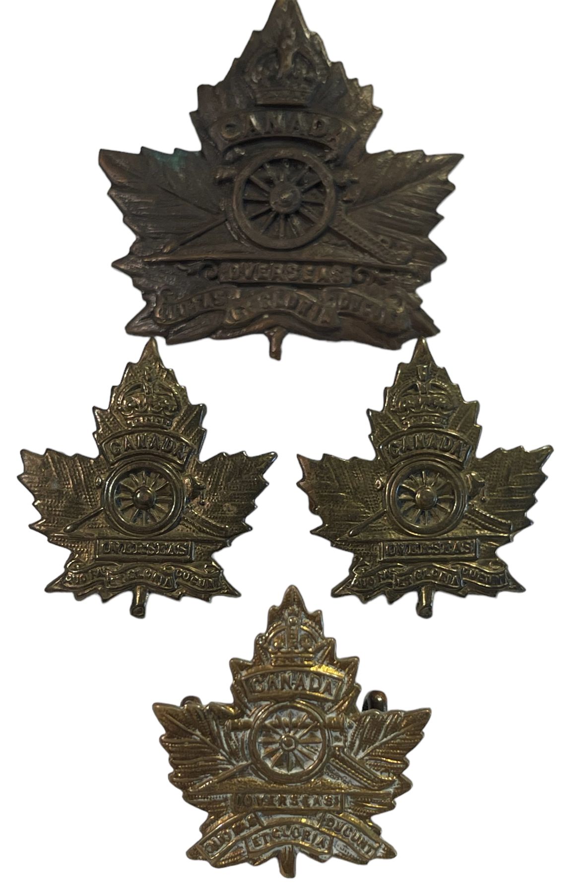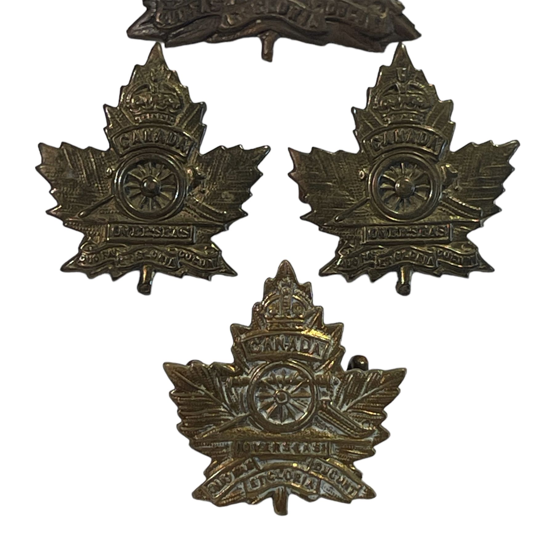 Lot of 4. Cap is age toned Brass metal with Lug fasteners. Three collars, all with lugs. Maple Leaf, style D.