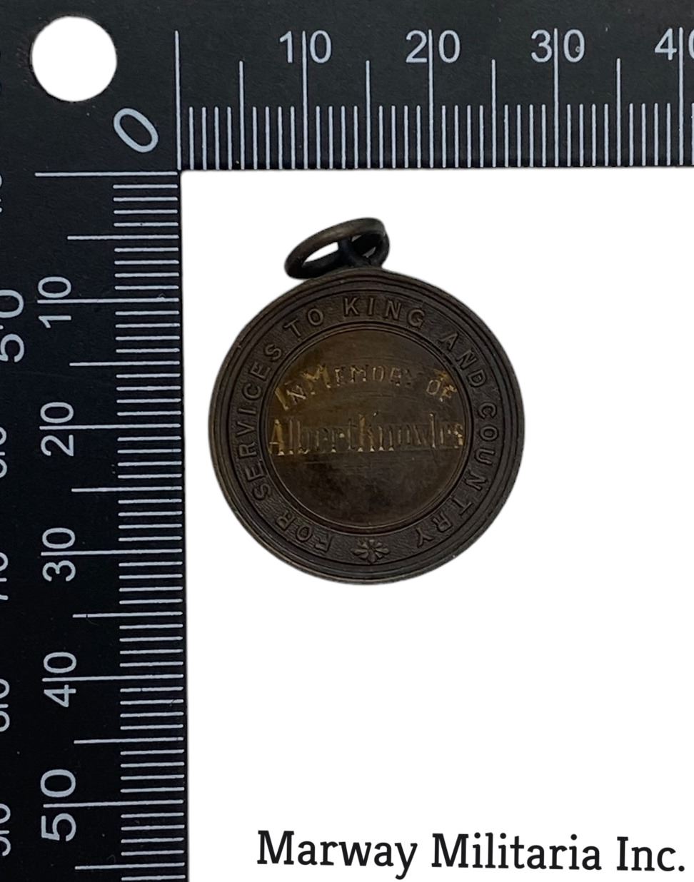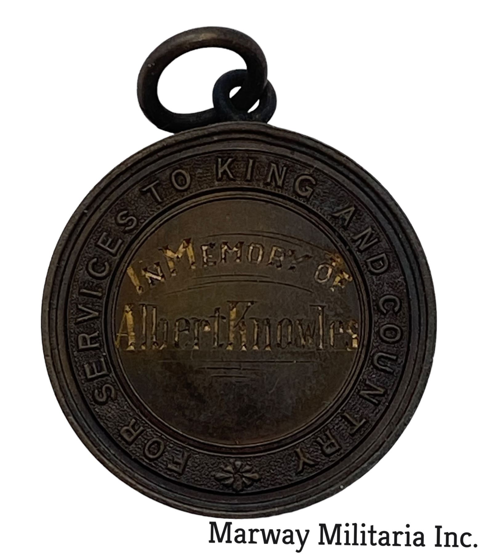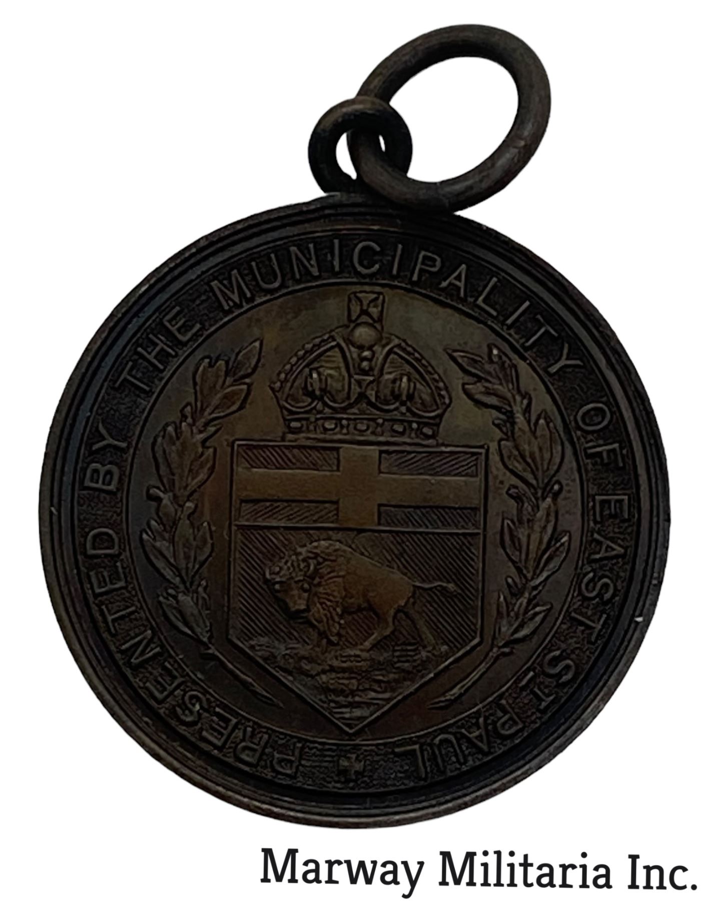 In Bronze. Crest of Manitoba in centre, PRESENTED BY THE MUNICIPALITY OF EAST ST PAUL". On reverse "FOR SERVICES TO KING ND COUNTRY". Engraved IN MEMORY OF ALBERT KNOWLES. Knowles was KIA September 1916.