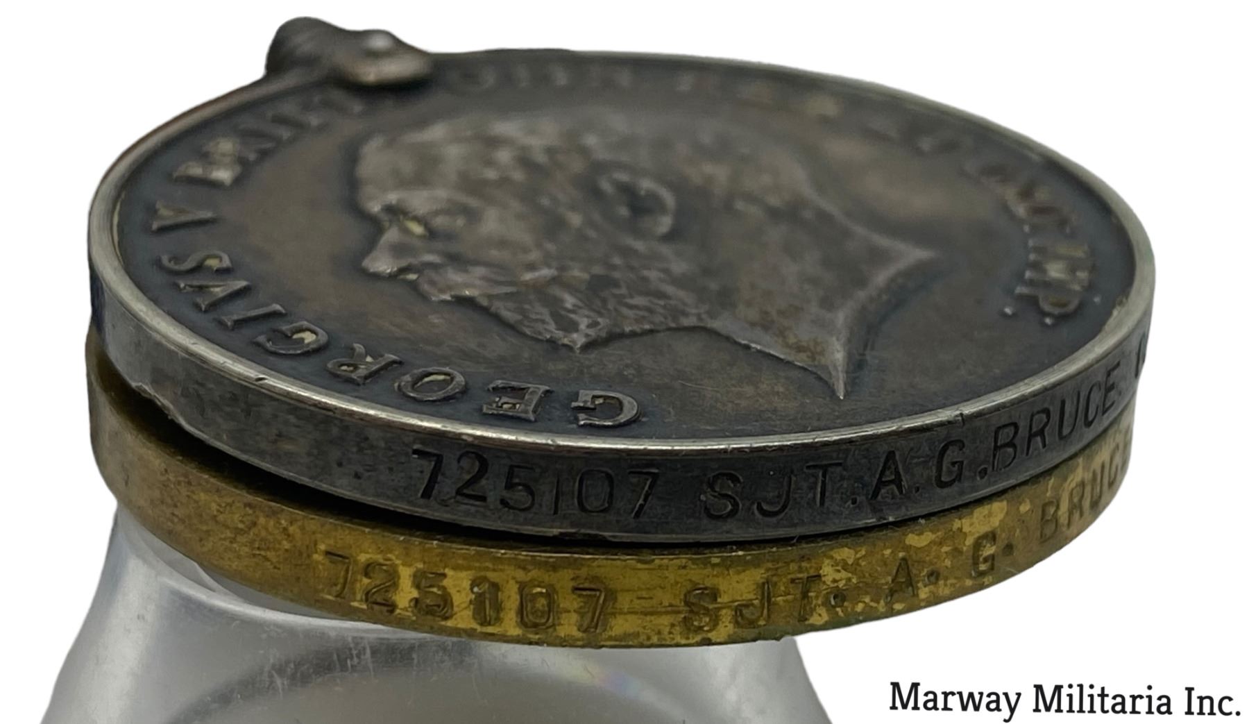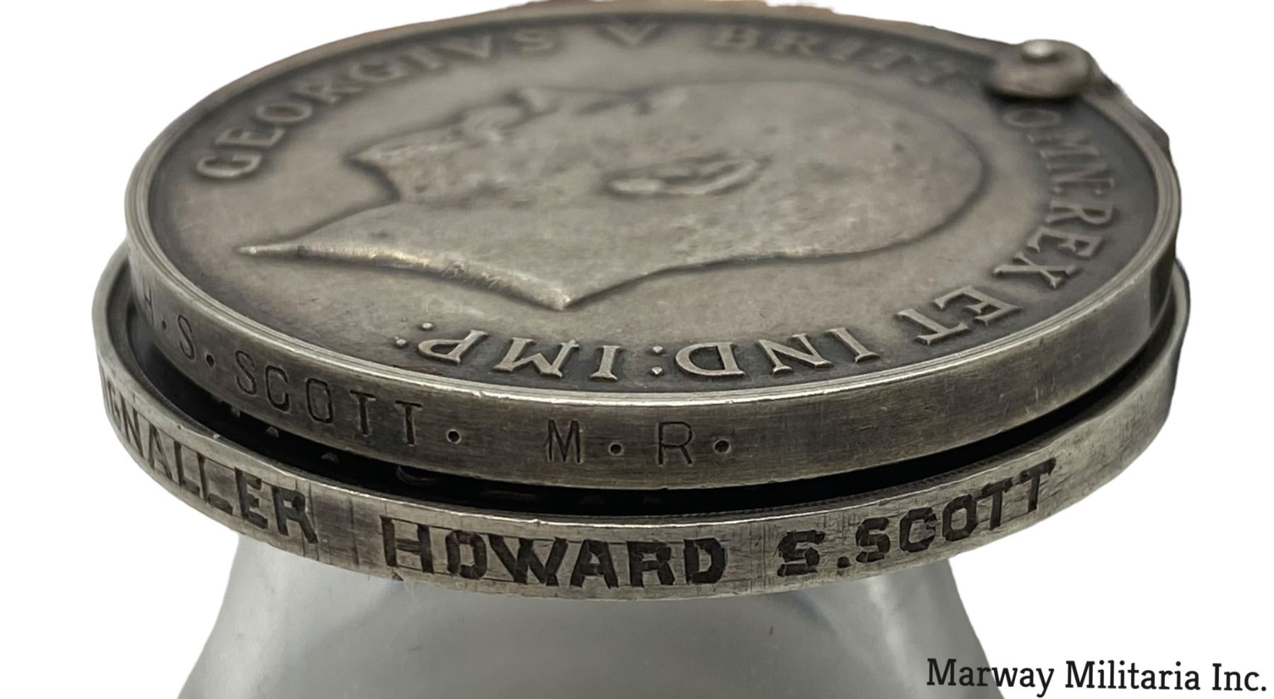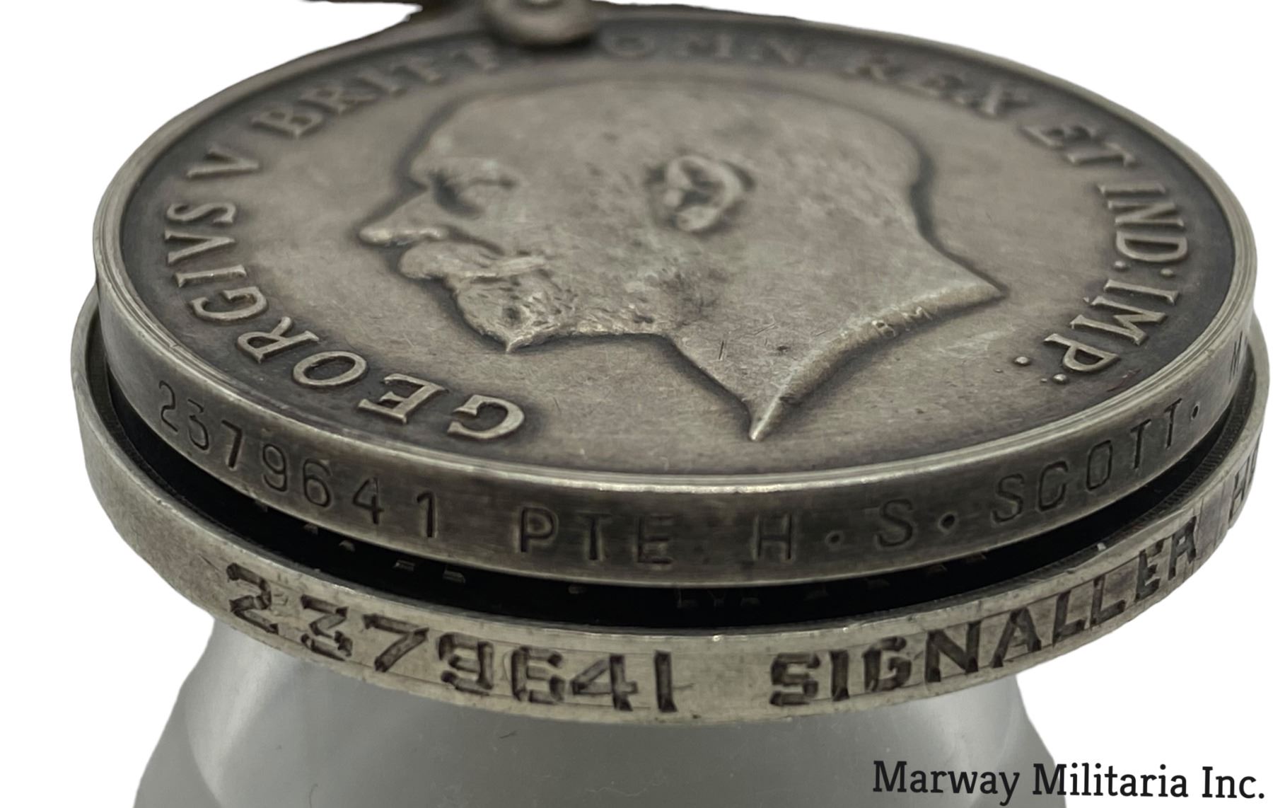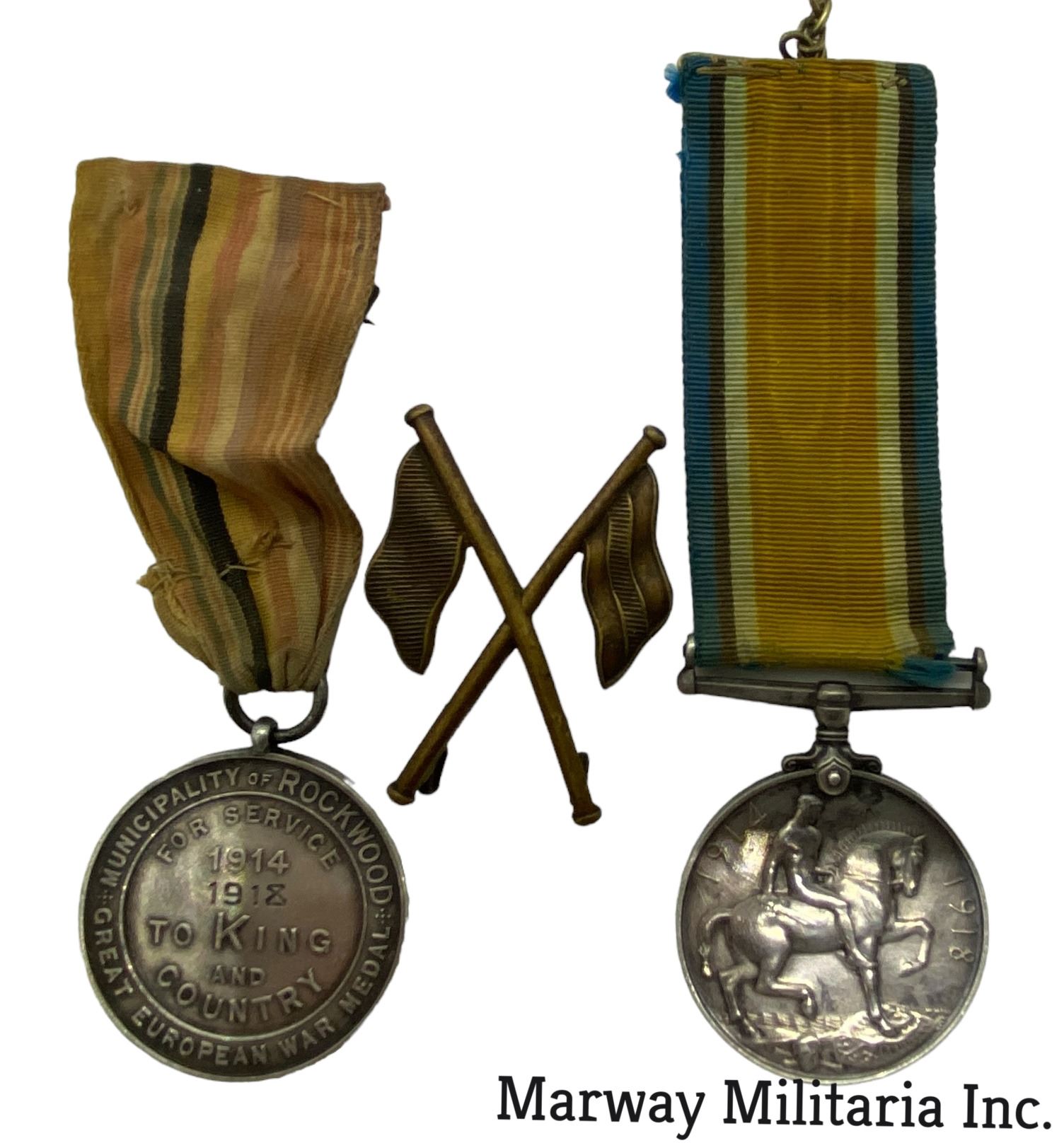Lot of 3. Silver war medal, impressed 2379641 PTE H S SCOTT M.R. (Manitoba Regiment). Silver Welcome home medal from Rockwood Manitoba, Impressed on rim 2379641 SIGNALLER HOWARD S SCOTT. Brass signal badge.
