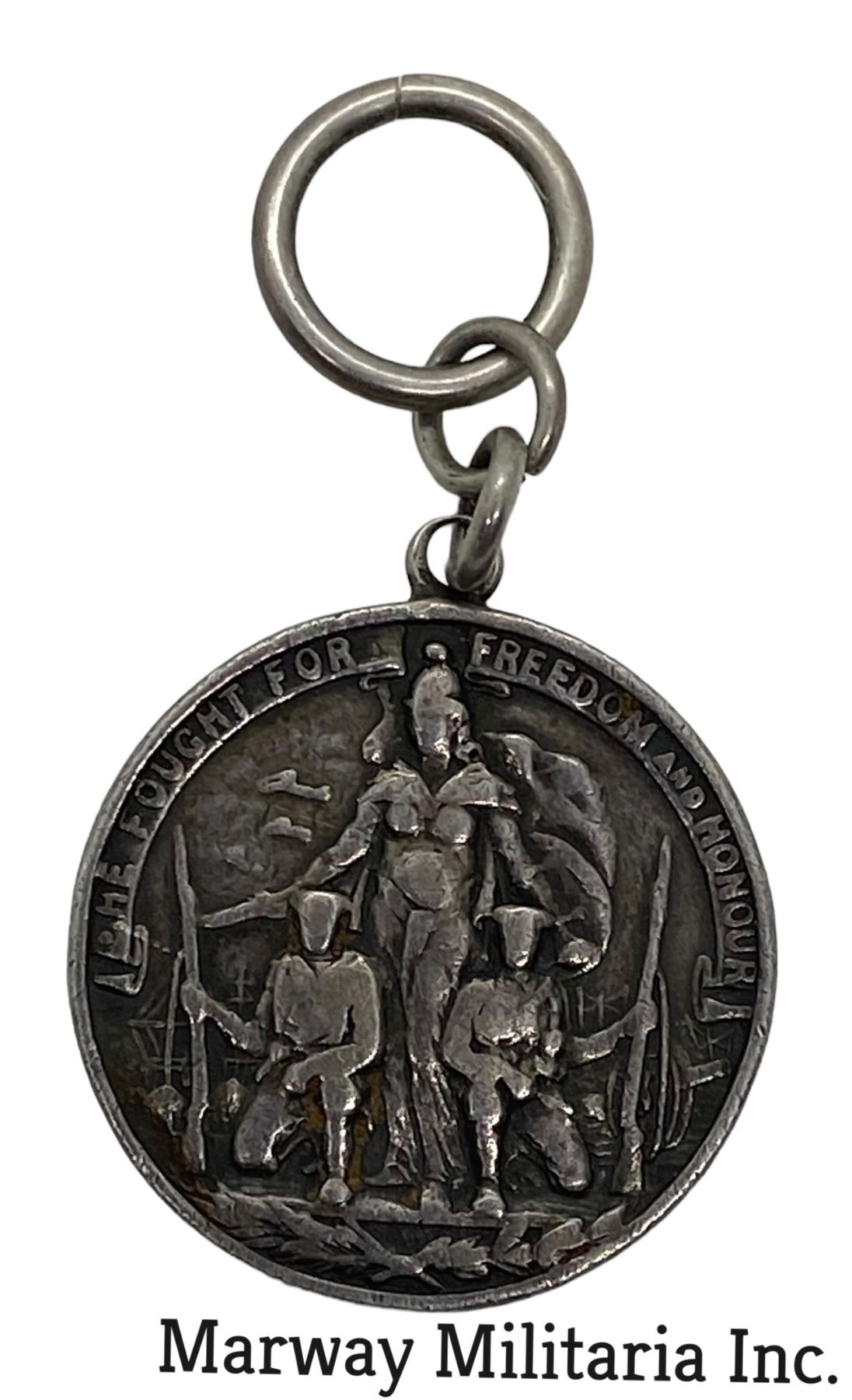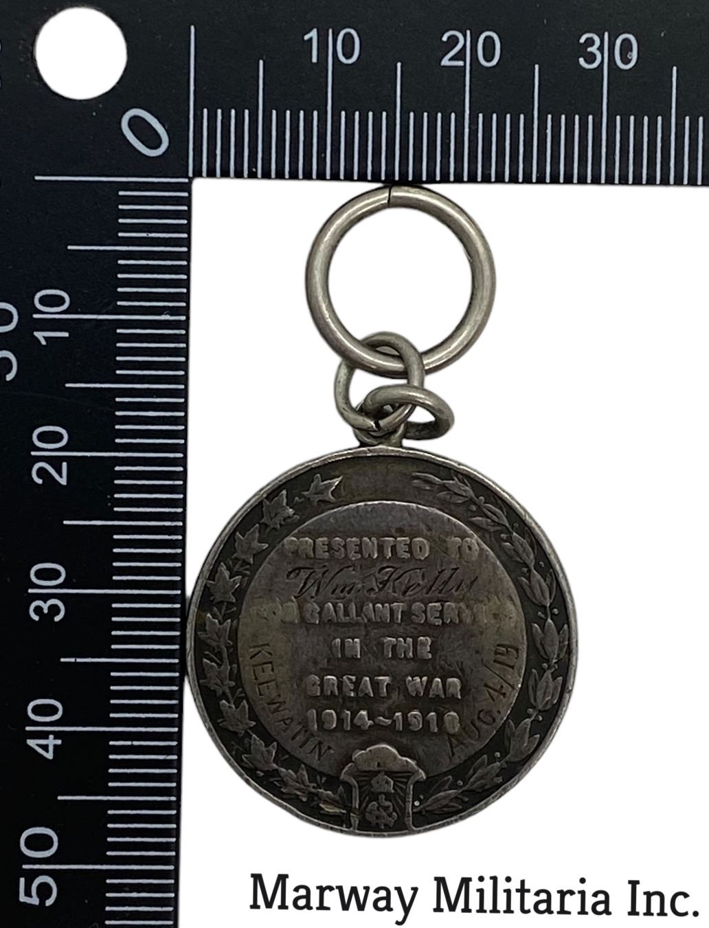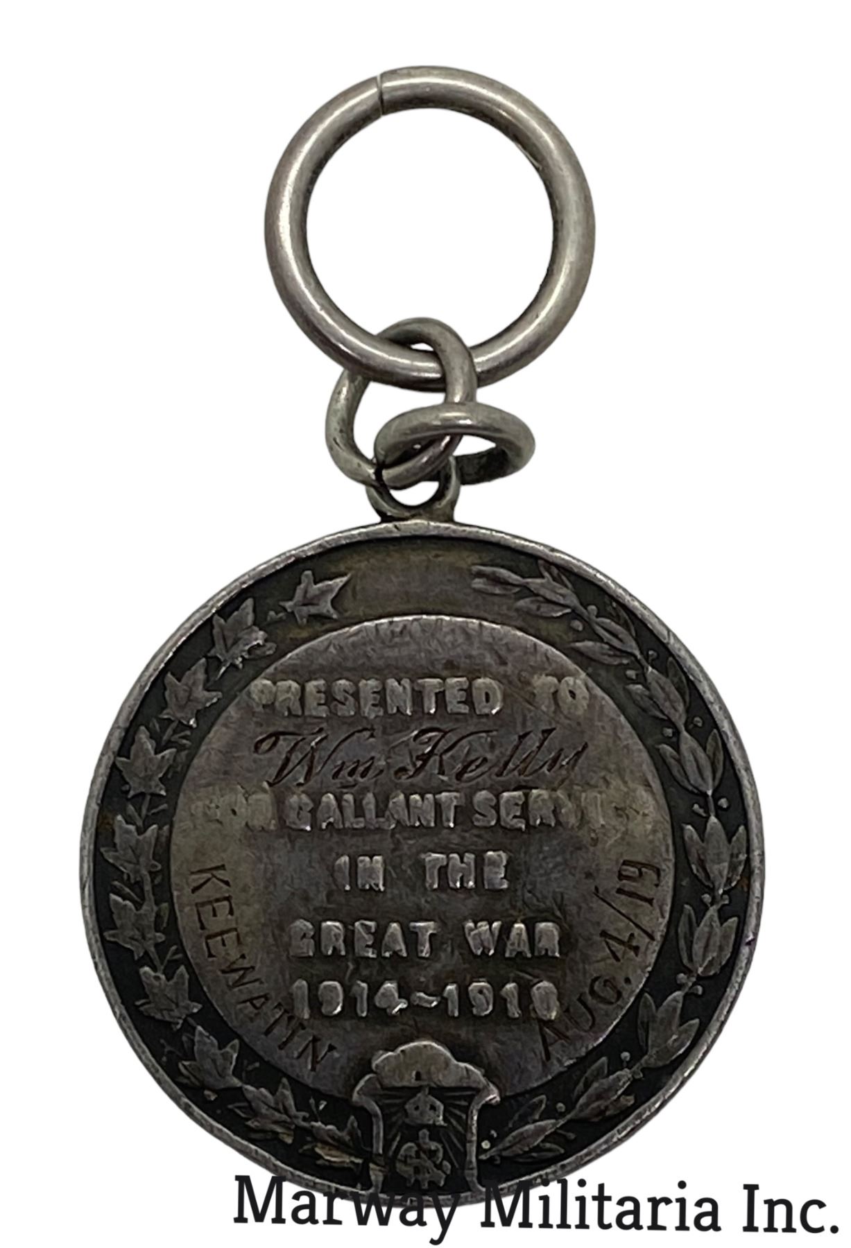 Silver metal. Engraved WM Kelly Keewatin Aug 4 / 19 on reverse.
