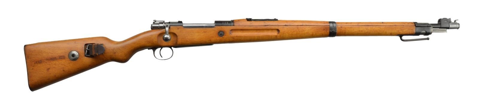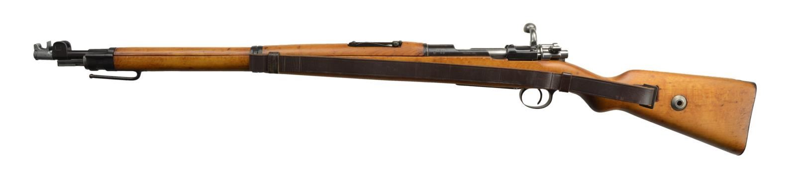 Cal. 8mm Mauser. S #7581kk. Back half of bolt body is S # 61, the bolt handle has been ground off and renumbered to match in a modern looking font. All other visible S #'s are matching with the front band and stacking hook also possibly being renumbers. Bottom of front band keeper also shows a modern "81" number. Bbl. 23 3/4" Bbl. Top of receiver marked w/ Imperial crown, "ERFURT" & 1917 date. Right side of receiver marked w/ three German proofs and a crown RC stamp. Left of receiver marked w/ Prussian eagle & S #. Left side rail marked "Kar. 98" in Gothic script. Turned down bolt handle w/ checkered knob. Tangent rear sight graduated to 2000 meters. Inverted V front sight w/ protectors. Bayonet lug & stacking bar are present. Provision for side sling. Leather sling present that does not appear to be correct for this model. Beech hardwood stock set w/ partially faded Imperial proofs and a "B" beech marking. UNATTACHED ACCESORIES: hinged Kar98a muzzle cover. CONDITION: lightly sanded beech stock has old added finish, some dings and handling marks. Bolt has been polished bright. Blued parts show a mix of original finish and reblue w/ scattered fading. Fair bore w/ scattered frosting and light pitting. (22-2530/MJC). CURIO. $300-500.