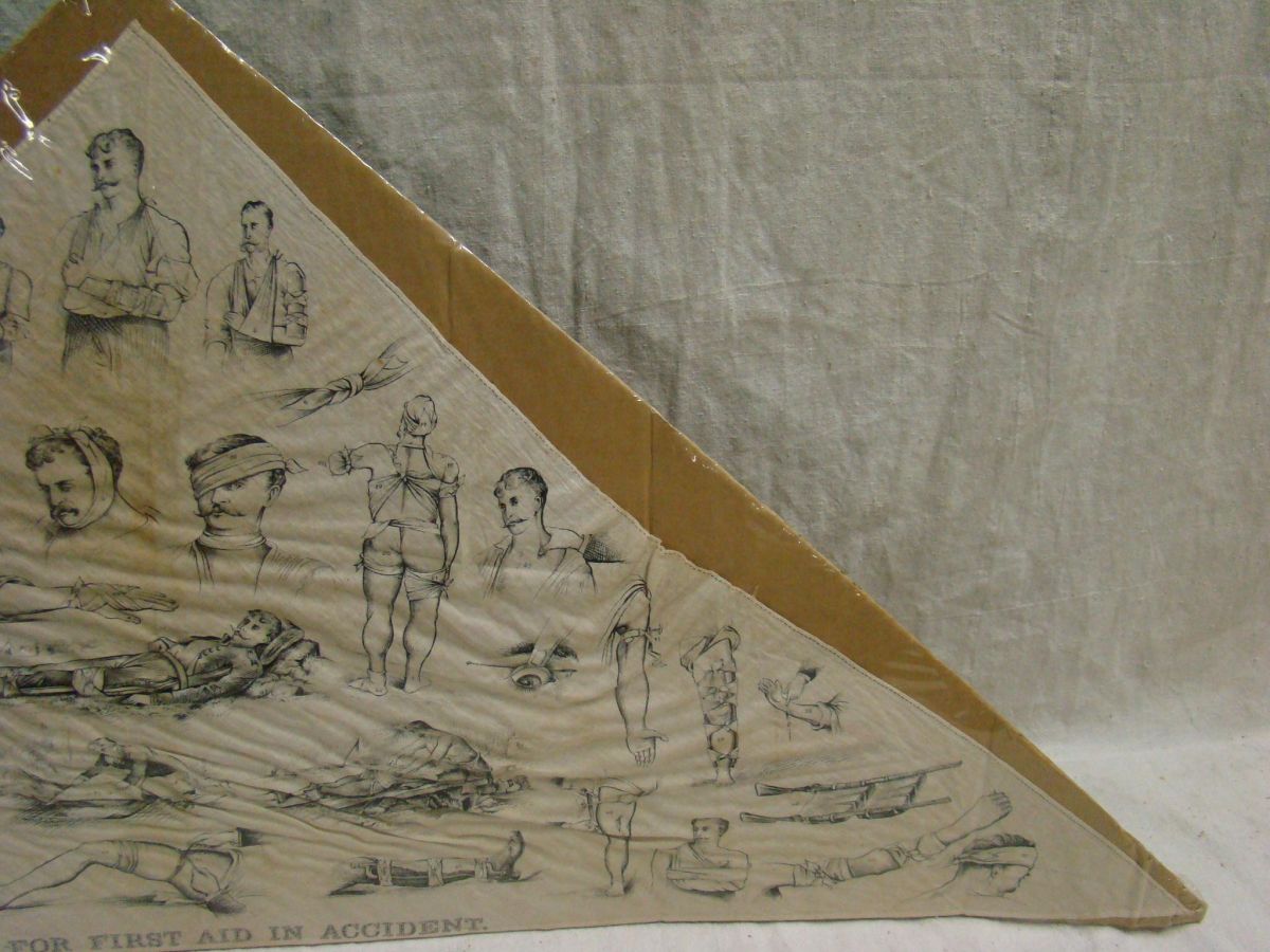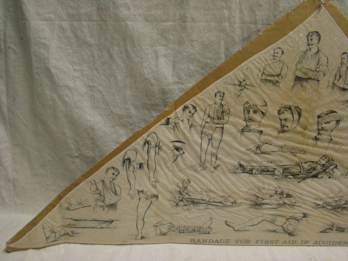 "BANDAGE FOR FIRST AID IN ACCIDENT" . 47" length at base. Printed with images of the bandage being used in a variety of situations requiring first aid.