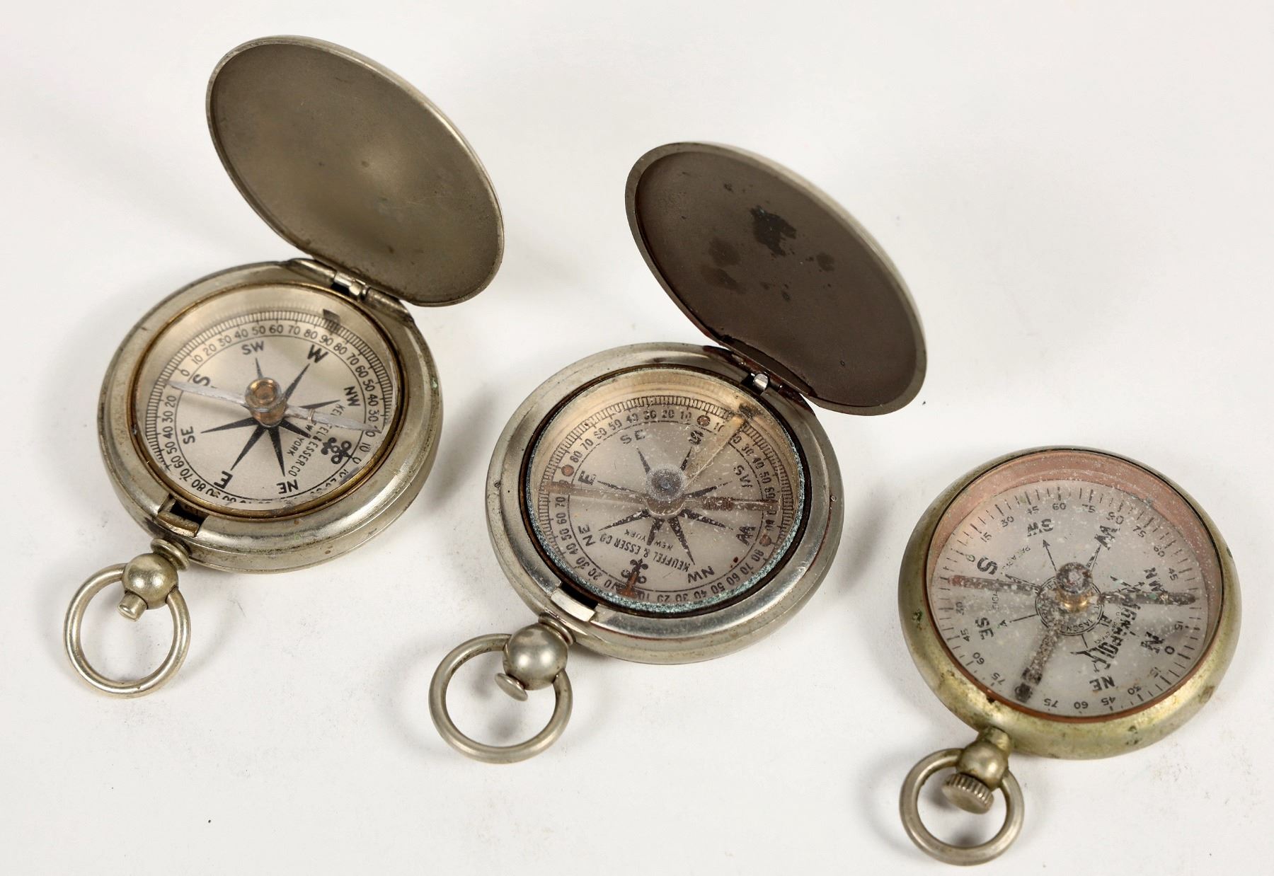 This group of WW1 compasses are two Keuffel & Essers and one Short & Mason. One K&E is marked on the cover as "Eng. Dept. USA 1915 #14762" with a clear lens. A second K&E has a cloudy lens. The Short & Mason is marked "1915 Magnpole" with a cloudy lens. From the Popovich collection. 1.75 in. in diameter. Please see photo for details.
