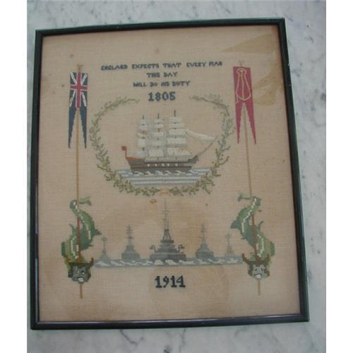 BURTON BROOK FARM ANTIQUES presents a WW1 ENGLISH SAMPLER OF EXTRAORDINARY CHARM. The sampler mounted under glass in a black wood frame. Sampler has old London framer label on back ( see Image ) / Sampler in frame is: 12 1/2" wide X 14 1/2" tall/ Condition: There are some dark small spots on the canvas and some light discoloration on the canvas. This last is very faint & not noticeable when hung and appears much darker on the JPG image you are viewing. This is a great WW1 collectable.