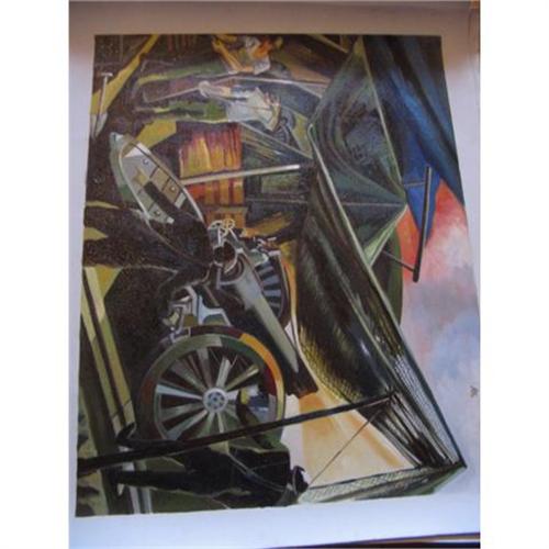 This is a nice reproduction oil painting. It is taken from a WW1 era painting by Paul Nash called A Howitzer Firing. The painting measures 20x16". It comes rolled unstretched on canvas. Any framer can easily stretch it. The painting is nicer then my photo shows. Buyer pays $12.50 priority airmail from Europe.